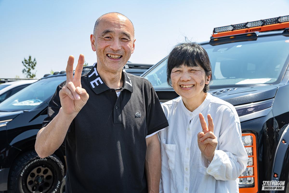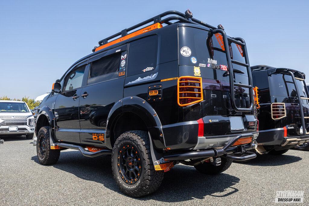 大型のエアインテークダクトを備えたボンネット、グリル、オーバーフェンダーなど、カディスのボディパーツでコーディネイトされたD:5を所有するシゲオさんは、横浜からの参加。足まわりはカディスのキットで7インチリフトアップ。ヘッドライトガードやドアミラー、ルーフキャリアにさりげなくあしらわれたオレンジのアクセントも演出効果バツグン!
