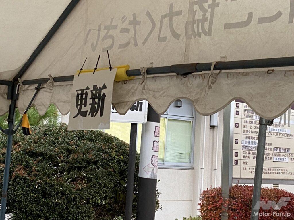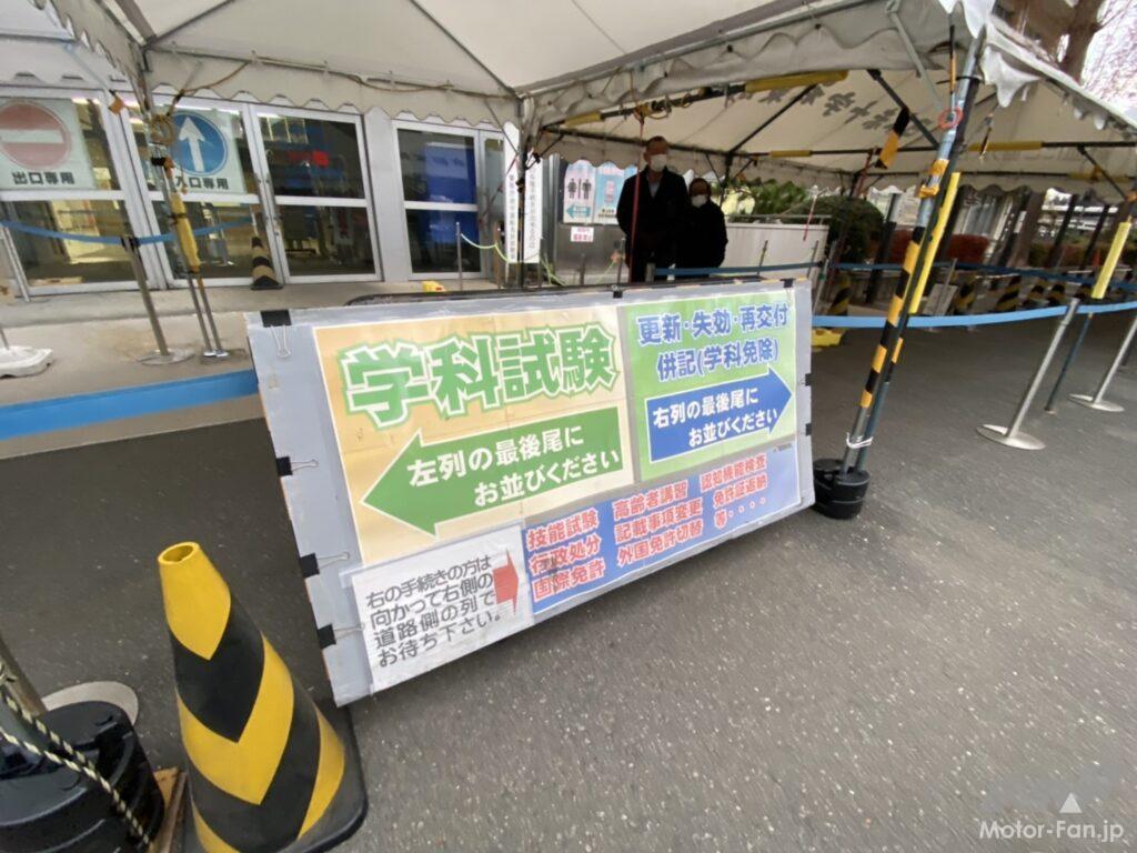 クルマを置いて試験場に行ってみると、「試験」と「更新」の列が別々に設けられていた。間違って並ぶと、並び直さないといけないので、これは注意が必要だ。