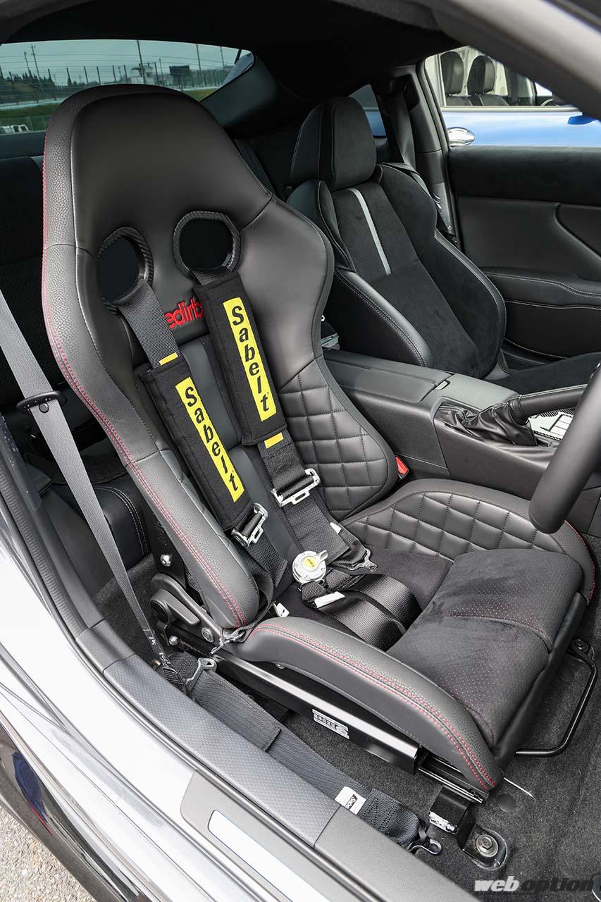シート表皮がウルトラスエード×本革となるRZグレードとのバランスを重視し、エディルブ172をブラックの6点式ハーネスとともにインストール。キルティングレザーやレッドステッチの高級感は抜群だ。