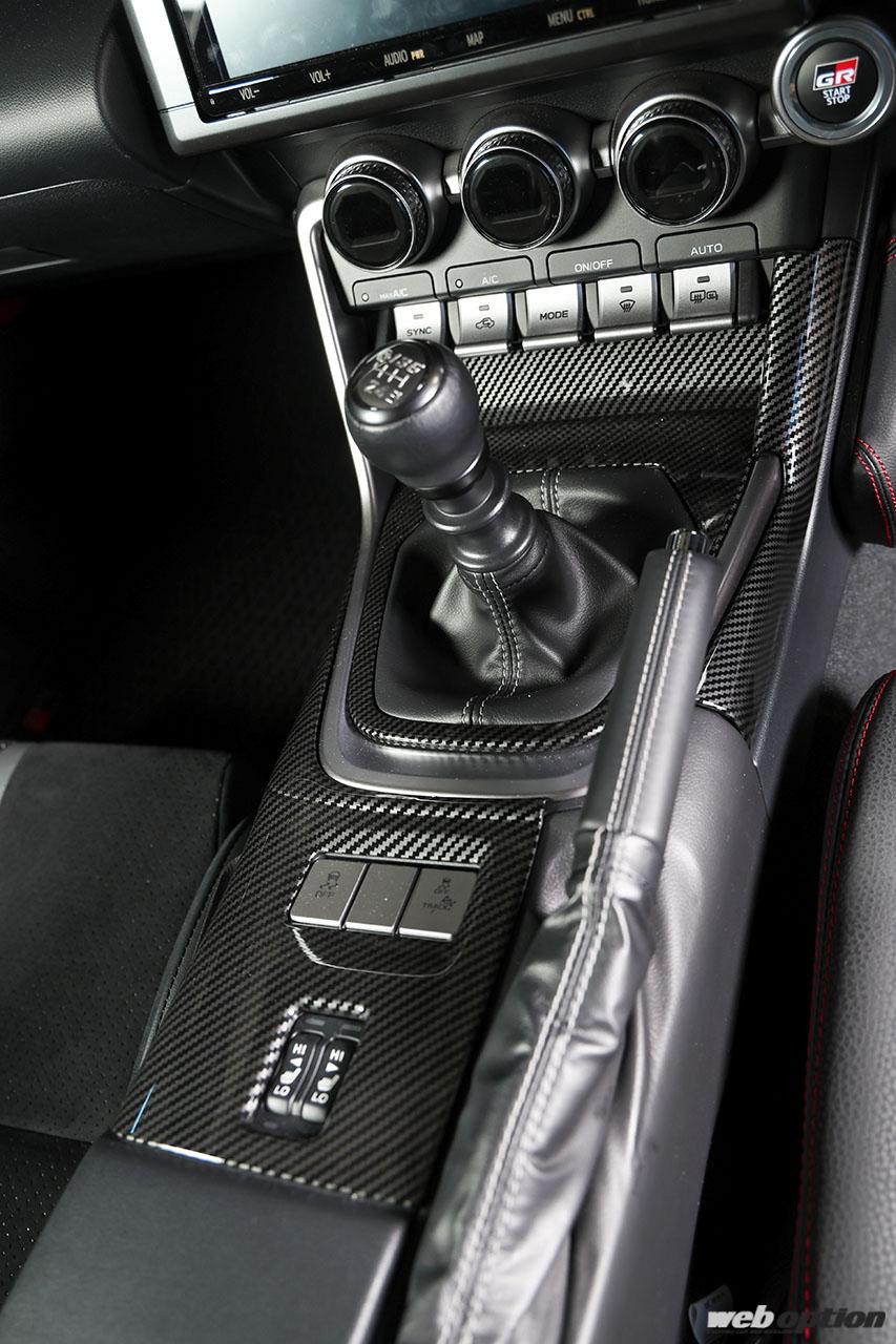当初はインテリアカスタムに興味はなかったが、ステップアップチューンで変化する愛車に合わせて高級感あるスポーティさが楽しめるカーボンパーツも投入。エクステリアと同じく、濃色で巧みに見映えを引き締めている。