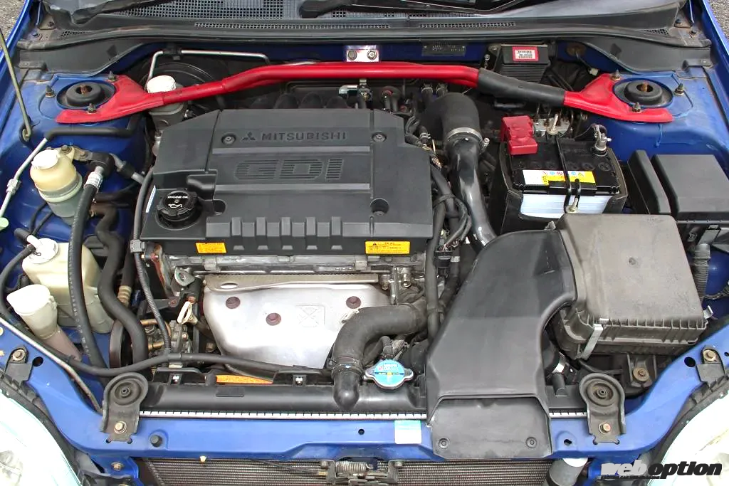エンジンはお馴染み2.0Lの4G63に対してボア径が4mm小さいφ81.0、ストローク量は1mmアップとなる89.0mmから1834ccを稼ぐ4G93。直噴GDIのターボ仕様はパジェロイオやディオンなどにも搭載されたエンジンだ。効率よく走行風を採り入れられるよう、フロントグリル裏にインテークダクトが設けられる。
