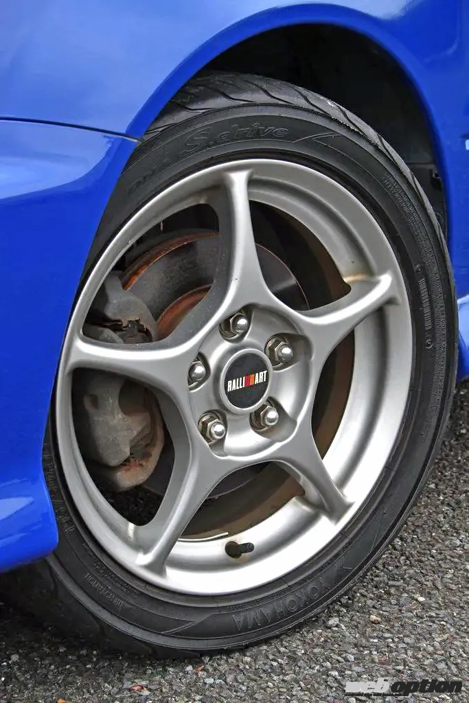 アルミホイールは標準装備の専用16インチ。センターキャップにラリーアートのロゴが確認できる。組み合わされるタイヤは195/50R16サイズのヨコハマDNA Sドライブ。
