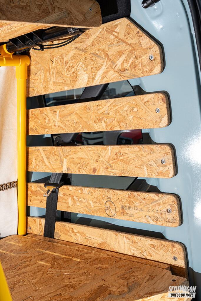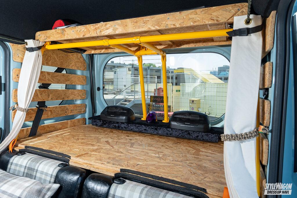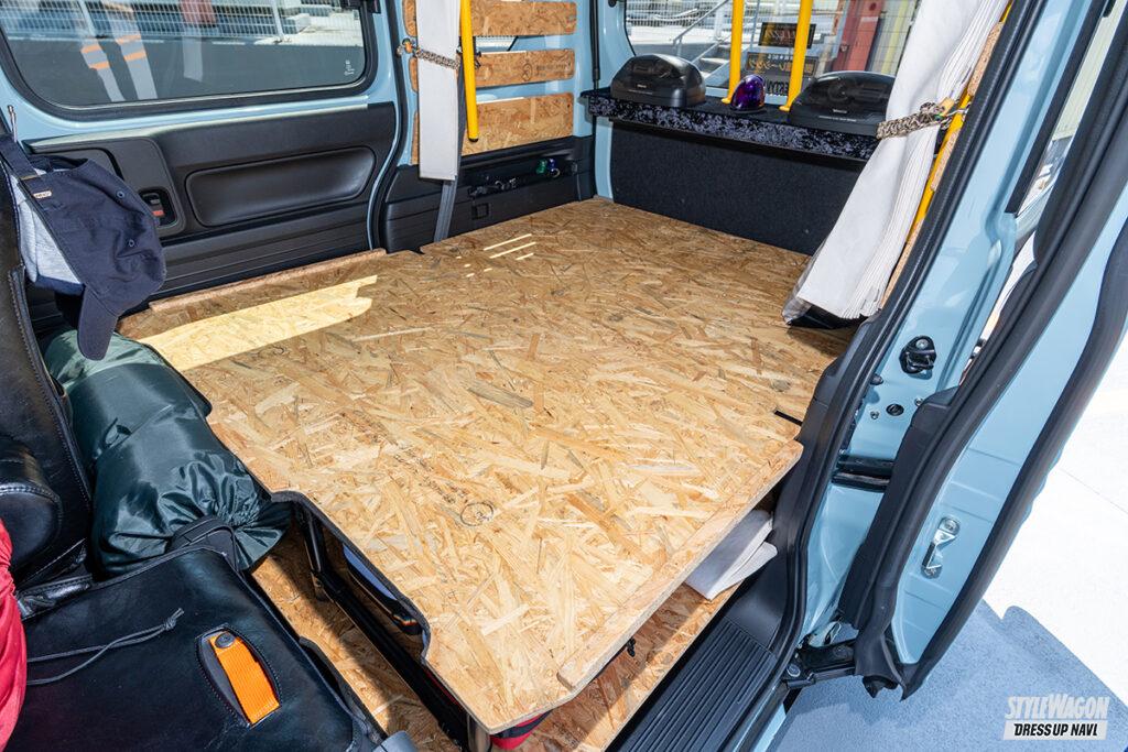 satorun8008さんのN‐VANはそれだけでは終わらない。ラゲッジには広大なスペースを活かした車中泊仕様を作りあげている。しかも、これも全て自作。ホームセンターで木材を購入し、ジグソーで切り出しながら作ったという。