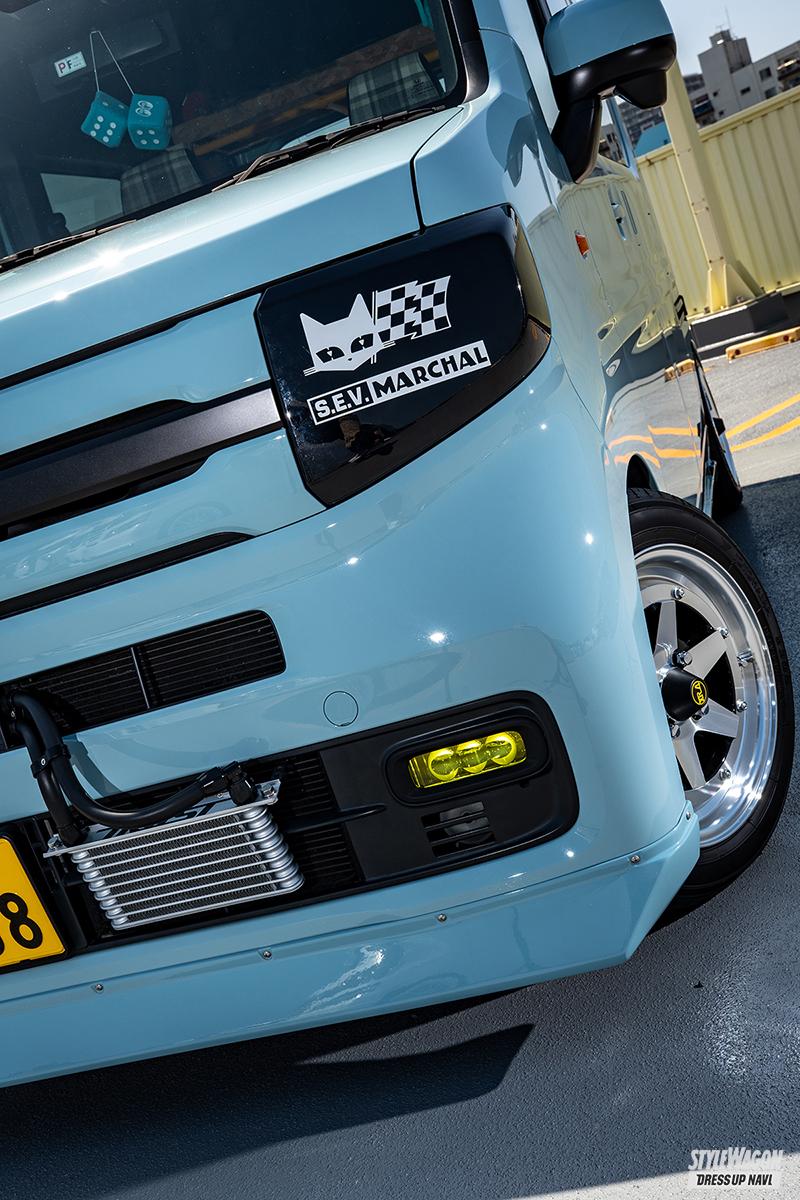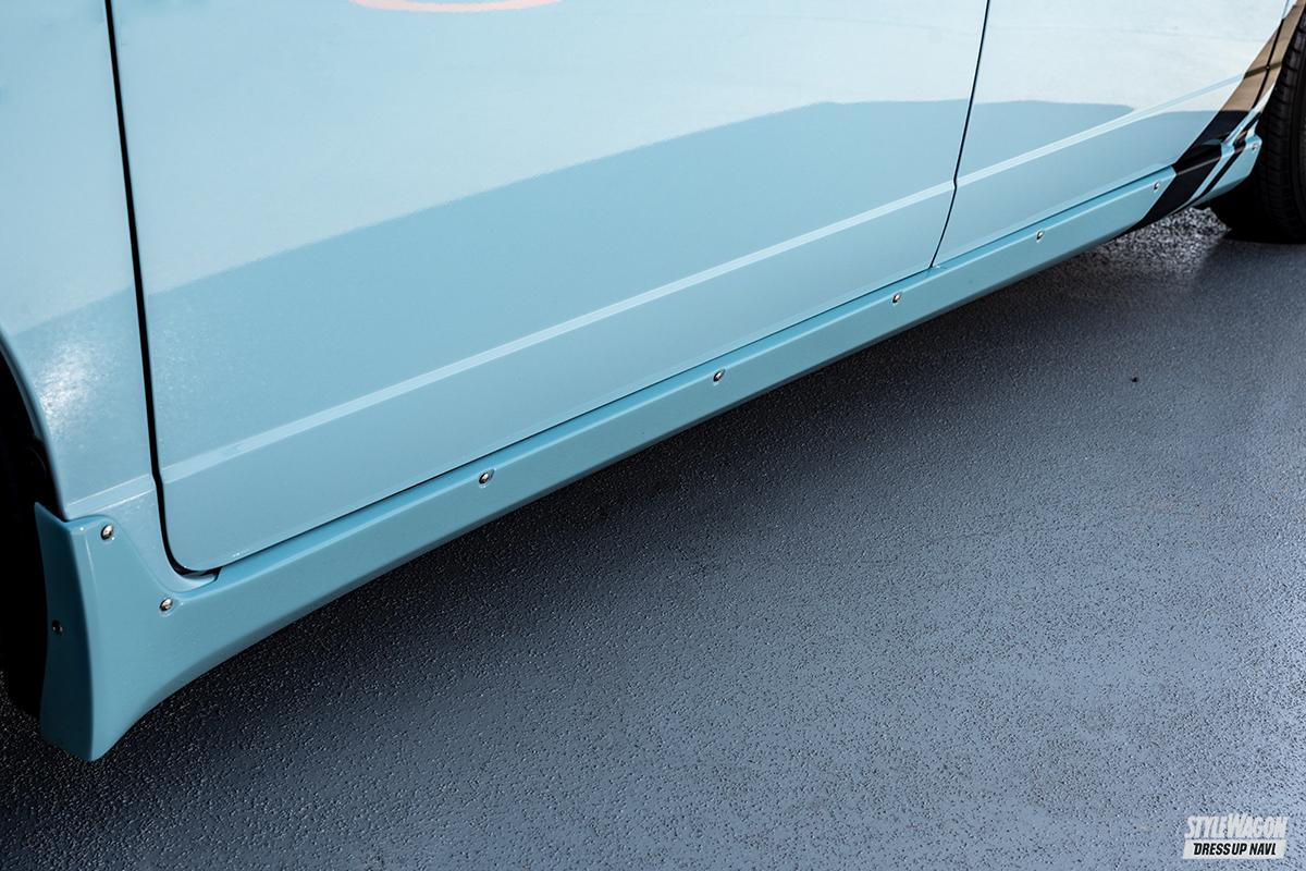 狙ったのは80年代の街道レーサー風。そのため、フロントバンパーにはダミーのオイルクーラーを置き、ボディサイドにはナックルラインを自作。また、ホイールはロンシャンの復刻版を履いた。