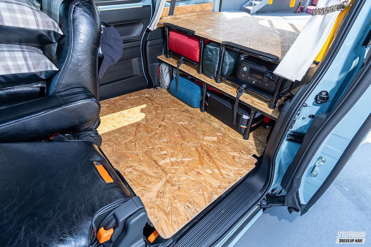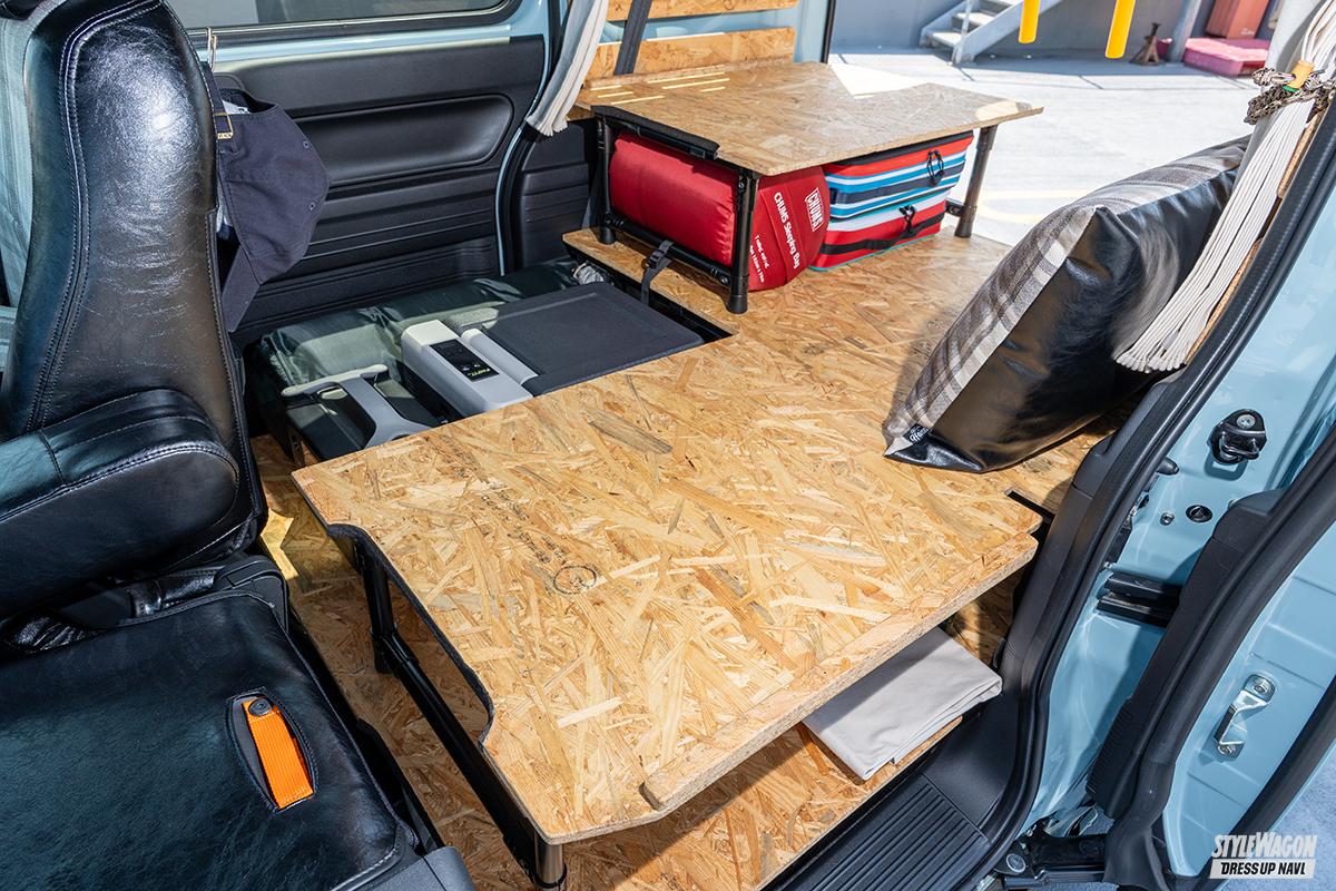 satorun8008さんのN‐VANはそれだけでは終わらない。ラゲッジには広大なスペースを活かした車中泊仕様を作りあげている。しかも、これも全て自作。ホームセンターで木材を購入し、ジグソーで切り出しながら作ったという。