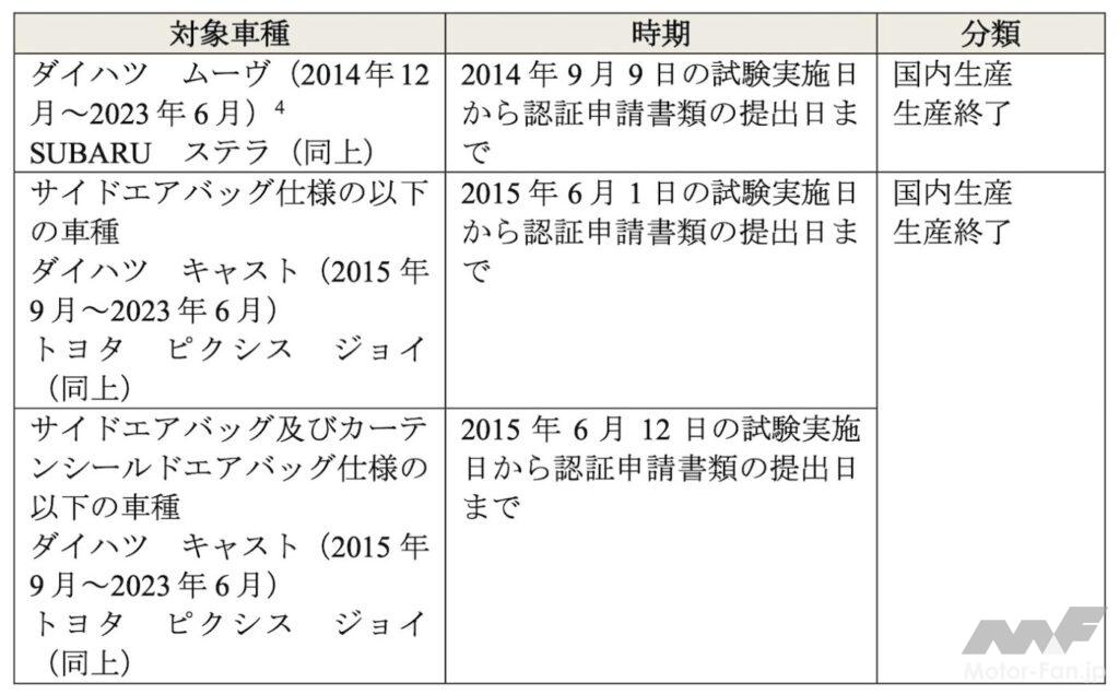 調査報告書(概要版)には、以下のように記載されている。 エアバッグのタイマー着火(不正加工・調整類型) 安全性能担当部署の試験実施担当者等は、側面衝突試験における認証試験では、本来、衝突時の衝撃をセンサーで検知してサイドエアバッグ及びカーテンシールドエアバッグをエアバッグECUで作動(以下「自力着火」という)させる必要があるにもかかわらず、届出試験の時点ではエアバッグECUが開発されていない段階であったため、届出試験において、衝突時の作動をエアバッグECUではなく、タイマーにより作動(以下「タイマー着火」という)するように以来する試験依頼票を作成した上、サイドエアバッグ及びカーテンシールドエアバッグをタイマー着火させる方法で届出試験を実施して、同試験によって得られたデータを記載した試験成績書を作成して、認証申請を行った。