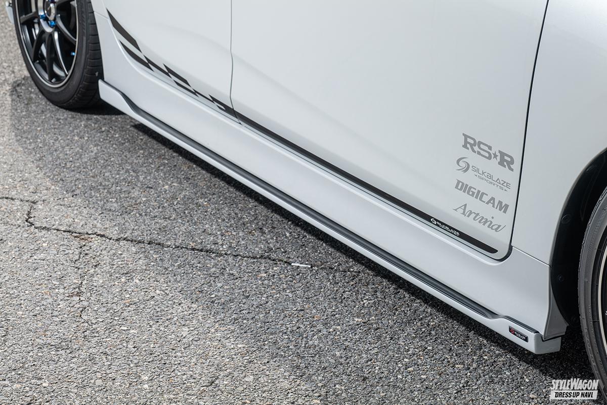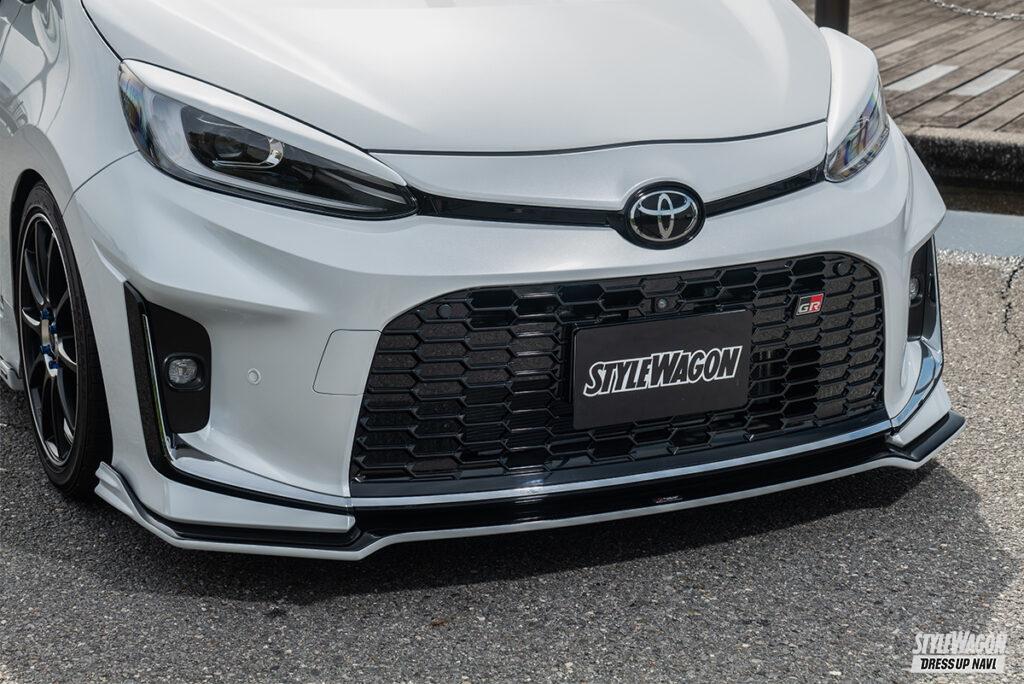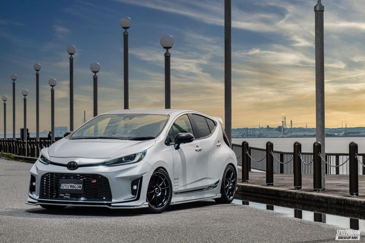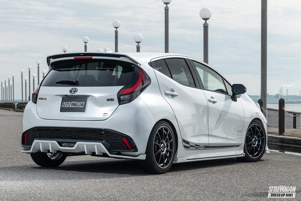 シンプルゆえの上質感にこだわるエアロブランド、シルクブレイズに、よりスポーティな味わいをプラスしたスピンオフシリーズがシルクブレイズスポーツ。その最新モデルとして登場したアクアGRスポーツ用エアロは、純正が持つ躍動感を確実に底上げつつも、都会の景色にも違和感なく溶け込めるスマートなレーシーフォルムが特徴だ。