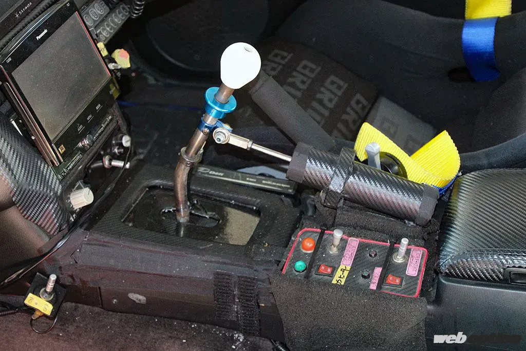 ミッションはOS技研のシーケンシャルドグを装備。通勤車両ということで、ストリートでも堂々と使えるようミッションまで含めて公認を取得しているのもポイント。ナビやオーディオ、エアコンも装備されており、街乗りでも問題なく使用できるクルマなのだ。