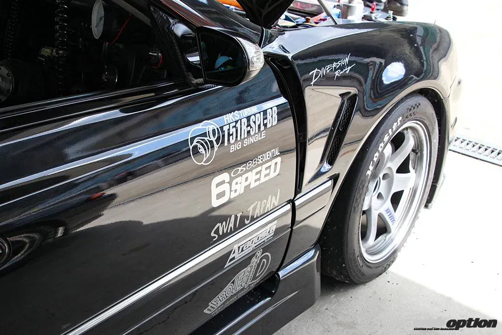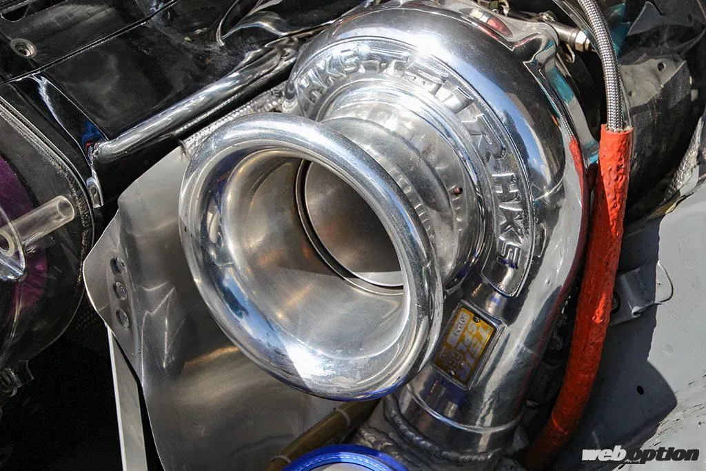超巨大なタービンは、HKSのT51RスペシャルBB。2.6L仕様ではタービンの立ち上がりが悪く、初期トルクが不足するということで、それを補うためのNOSもセット。全噴射時のピークパワーは1100psを超える。