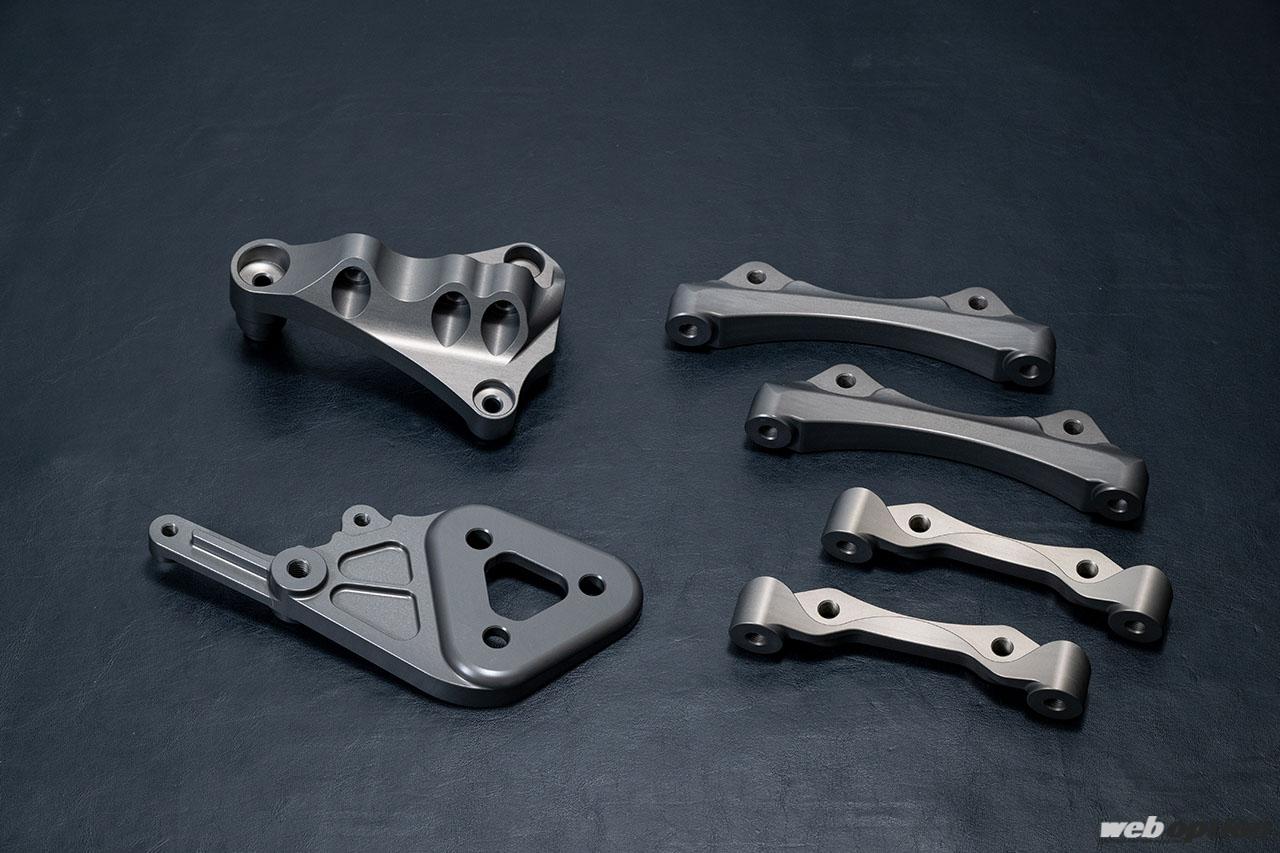 また、ブレーキキャリパーやデフ、エンジン用のアルミ削り出し軽量ブラケット(3万5200円〜)も、新たに追加されたホットアイテム。純正比0.5~1.0kg程度の軽量化となるが、バネ下部なので走りにもたらす効果は絶大。競技やタイムアタックユーザーにとって大きな武器となる。