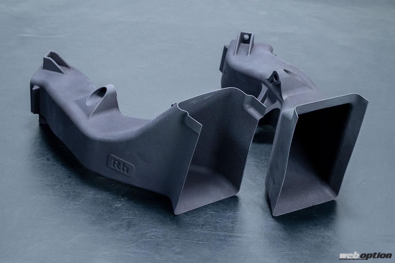 バンパー内に装着されている純正ダクトに対し、約2倍の大容量としたカーボン配合樹脂製のブレーキダクト(7万2600円)も見逃せない。ブレーキへの走行風が大幅に増大し、ブレーキ冷却性が向上する。