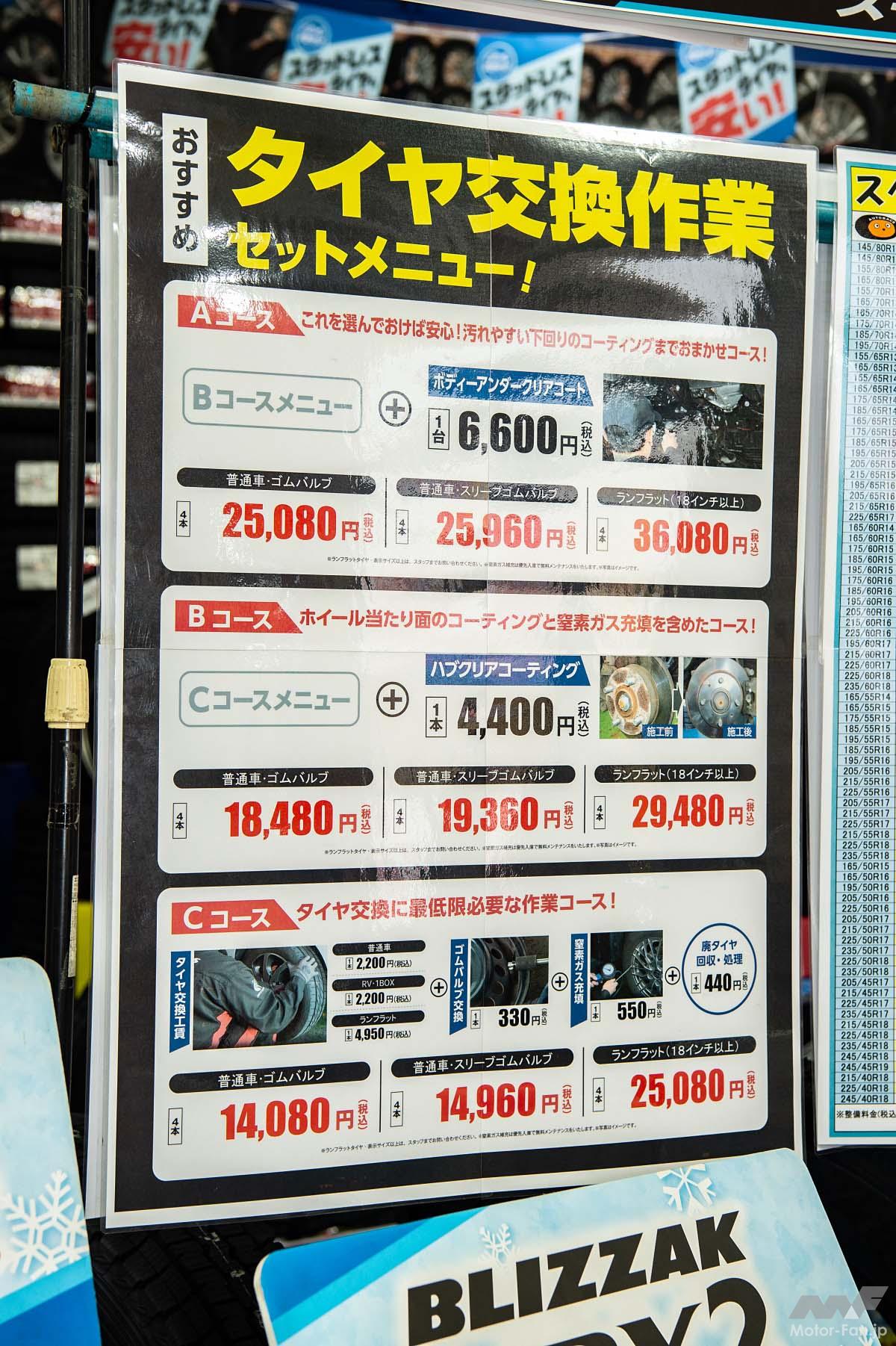 店舗の一等地に構えるタイヤ売り場には、お得なタイヤ・ホイールセットをはじめ、様々なブランドのスタッドレスタイヤが陳列されていた。近頃はオールシーズンタイヤの需要も高まっており、在庫を充実させているそうだ。