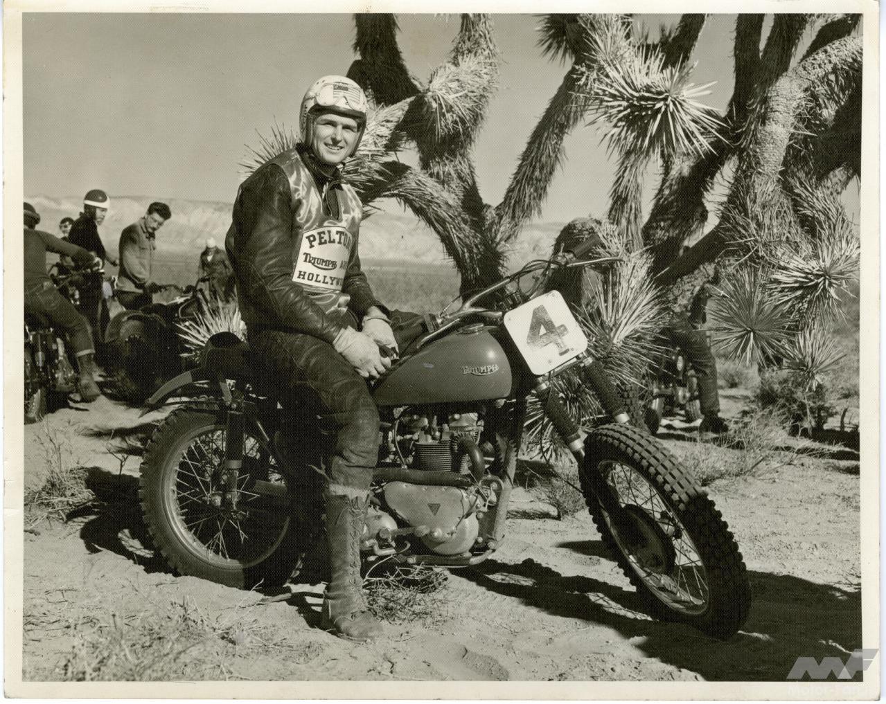 今回の試乗車はBUD EKINS (バド・イーキンス)の名を掲げた特別仕様。広報資料から引用すると、彼は「プロのスタントマンで、モトクロスとデザートレースのトップ選手であり、スティーブ・マックィーンの親友の一人でもあり、ライディングパートナーでもある」と書かれている。