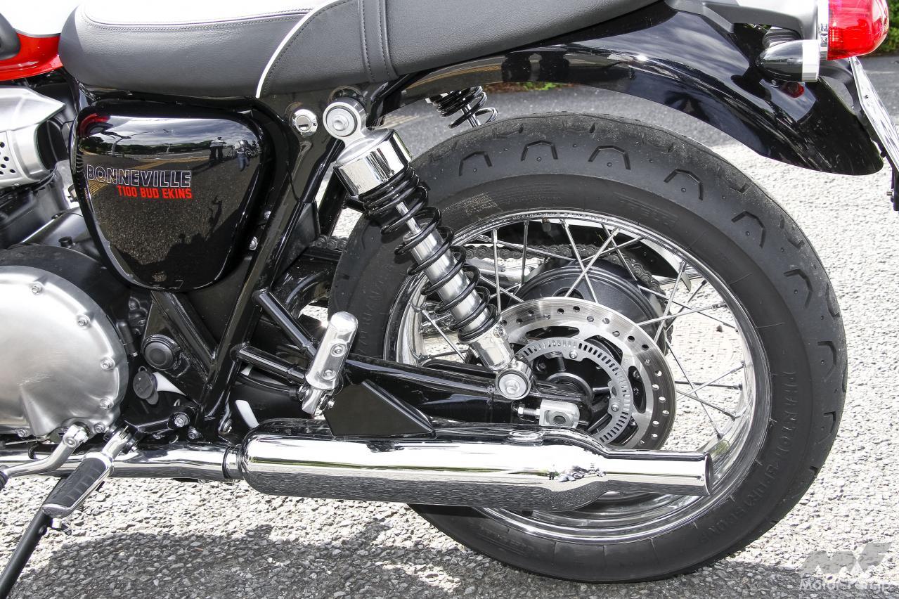 吸気系はマルチポイントシーケンシャル電子制御式の燃料噴射を、そして排気系にはクロームメッキで美しく仕上げられた2into2のキャブトンマフラーを装備。2 本ショックのスイングアーム式リヤサスペンションや、インナーチューブが蛇腹のゴムブーツでカバーされた正立式フロントフォーク。そしてスポークホイールの組み合わせ等、全てのデザインが歴史あるブランドへのリスペクトを感じさせてくれる。