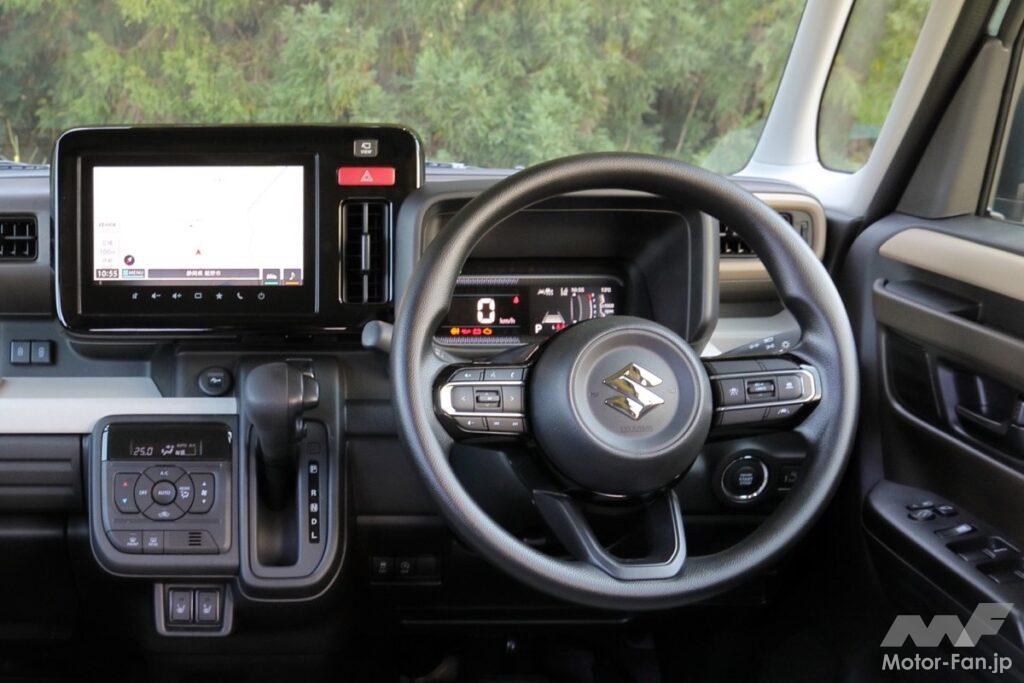 ピアノブラックトリムされた9インチモニターは液晶画面とのコントラストが見やすく、ハザードランプ位置もよく目立つ。デジタル表示に割り切った速度計も直感的に把握しやすい。ハイテンションスチールの採用で強度を確保し、細身にしたAピラー周りの視野の広さも合わせて、とても実用的で居心地のよい室内空間に仕上がっていると思えた。