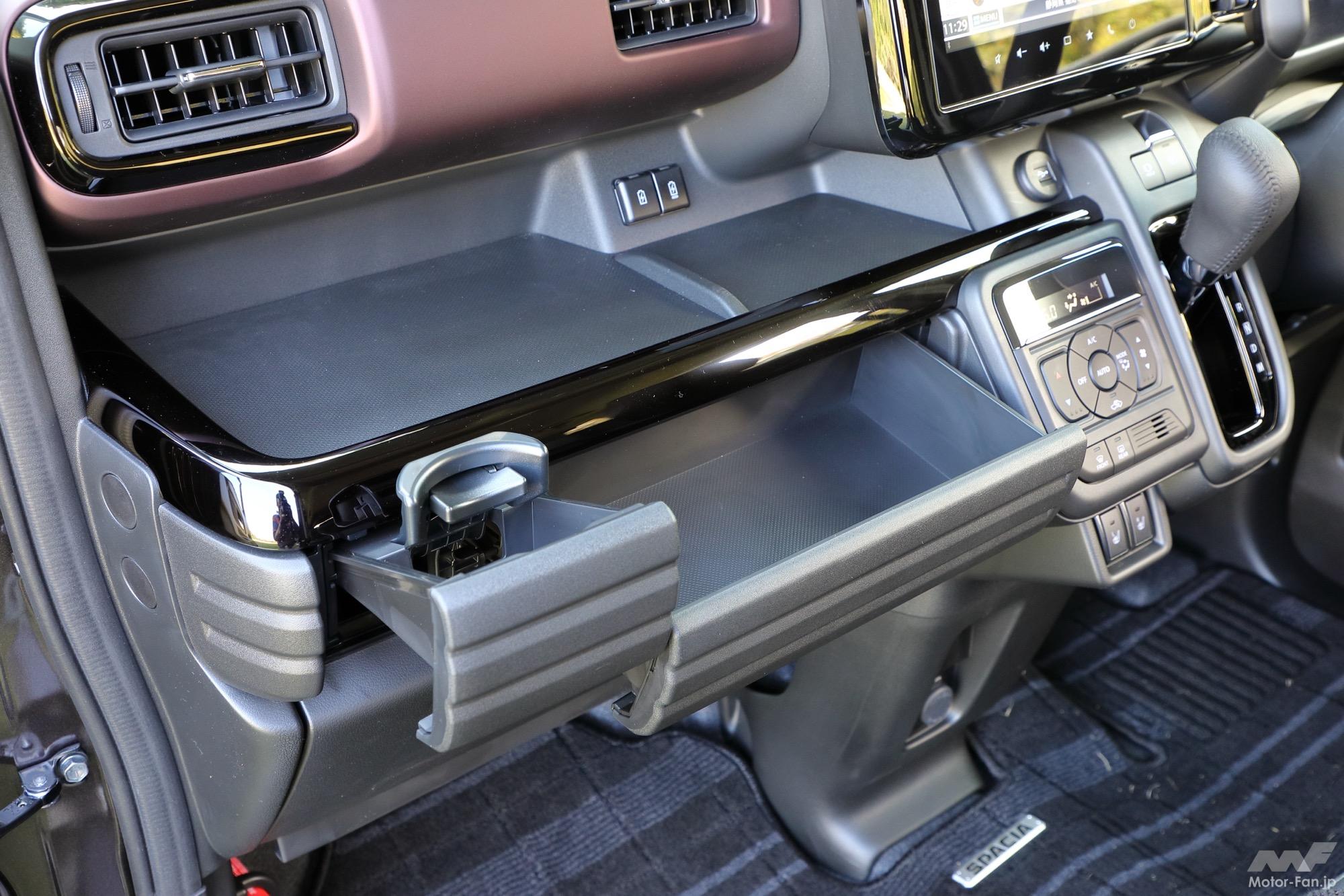 助手席側のダッシュ上部はその造形が立体的でスタイリッシュ。コロナ禍を経験して車中でご飯を食べたりくつろぐ時間が増えたことを踏まえ、ダッシュ下部は先代のボックス形状からトレータイプに改められた。