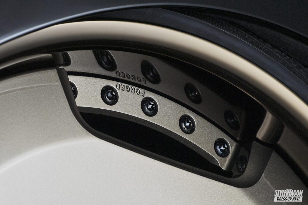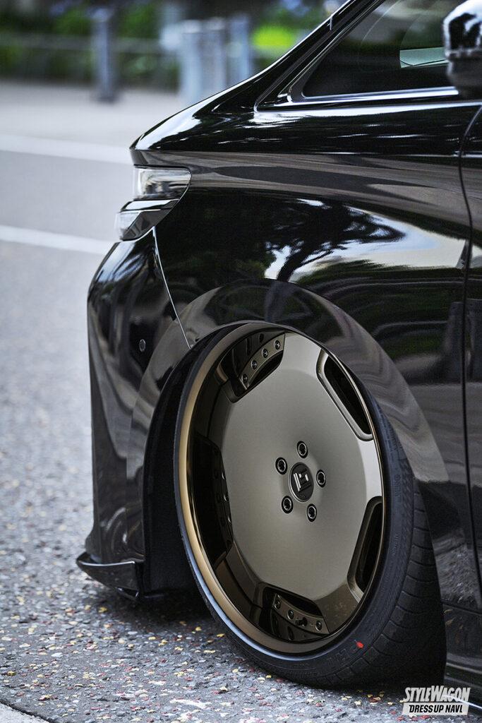 全身黒尽くめ、エアサスによるフルボトムのヴェルファイア。22インチのアダマスをタイトに飲み込む姿は、イカツさに加えて威厳すら漂う。その源は、このブラック仕様に合わせたカスタムオーダープランによる所が多い。ディスクはLSの代名詞的なスーパークロームメッキではなくチタンゴールド。リムはブロンズアルマイト、ピアス&オーナメント等はブラック系。クルマのカスタムに合わせてホイールもまた魔改造済みなのだ。この懐の深さがワークの強み。オーナーの思いに確実に答える体制が整っているのだ。