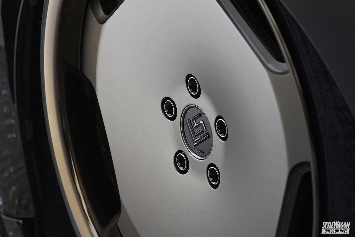 全身黒尽くめ、エアサスによるフルボトムのヴェルファイア。22インチのアダマスをタイトに飲み込む姿は、イカツさに加えて威厳すら漂う。その源は、このブラック仕様に合わせたカスタムオーダープランによる所が多い。ディスクはLSの代名詞的なスーパークロームメッキではなくチタンゴールド。リムはブロンズアルマイト、ピアス&オーナメント等はブラック系。クルマのカスタムに合わせてホイールもまた魔改造済みなのだ。この懐の深さがワークの強み。オーナーの思いに確実に答える体制が整っているのだ。