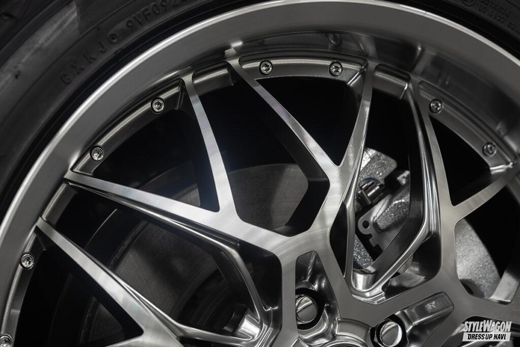 最大のアピールポイントとなっているのがリバースリムの採用により実現が可能となった、重厚感あふれるディープリム形状。昨今のアル&ヴェルのカスタムシーンでは大口径は絶対必須。さらに、存在感高まる深リムも求める声が多いだけに、ストレートに表現された奥深さはインパクトも絶大だ。 また、フィニッシュはこだわりのハイパーシルバーポリッシュとすることで、Y字クロススポークを複雑に組み合わせた斬新なフェイス面の造形がリム全体にさりげなく映り込み、エレガントな足元を演出。サイズ設定も20、21インチと大口径がメイン。ノーマル+αのライトな仕様からアグレッシブなローダウン派まで様々なスタイルに対応可能だ。2025年度後半に向けてのホイール選びは、大径1ピース+ディープリムが一つのキーワードとなって来るかも!?