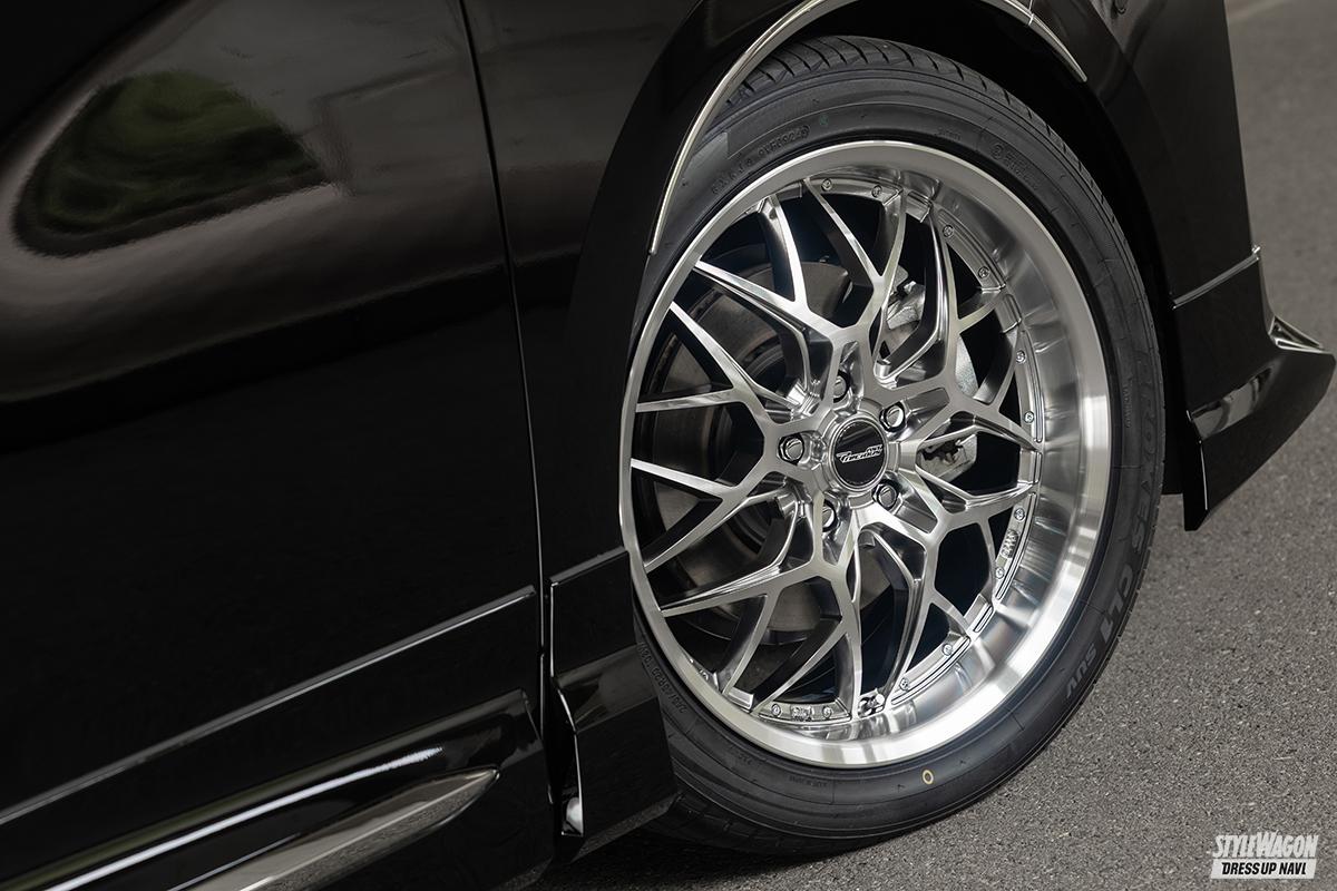 最大のアピールポイントとなっているのがリバースリムの採用により実現が可能となった、重厚感あふれるディープリム形状。昨今のアル&ヴェルのカスタムシーンでは大口径は絶対必須。さらに、存在感高まる深リムも求める声が多いだけに、ストレートに表現された奥深さはインパクトも絶大だ。 また、フィニッシュはこだわりのハイパーシルバーポリッシュとすることで、Y字クロススポークを複雑に組み合わせた斬新なフェイス面の造形がリム全体にさりげなく映り込み、エレガントな足元を演出。サイズ設定も20、21インチと大口径がメイン。ノーマル+αのライトな仕様からアグレッシブなローダウン派まで様々なスタイルに対応可能だ。2025年度後半に向けてのホイール選びは、大径1ピース+ディープリムが一つのキーワードとなって来るかも!?
