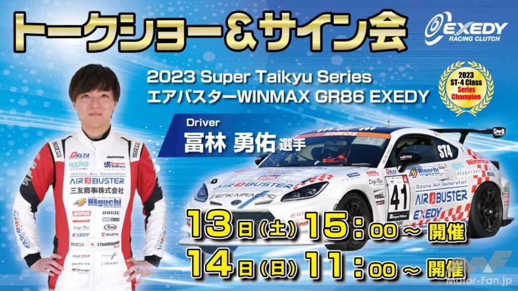 また、2023年のTOYOTA GAZOO Racing GR86/BRZ Cup 2023とS耐に参戦した冨林勇佑選手と、2023年JAF全日本ラリー選手権とラリージャパンに参戦した村田康介選手(ドライバー)・梅本まどか選手(コ・ドライバー)のトークショーとサイン会が開催される。