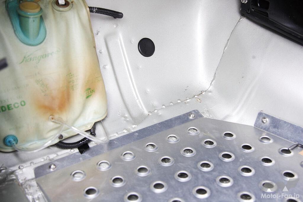まさに男の仕事場と言った雰囲気。運転席はブリットバケット、助手席はダッツンバケットだ。 フロア各部にはスポット増しが施され、ボディ補強してある。