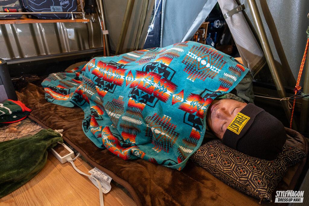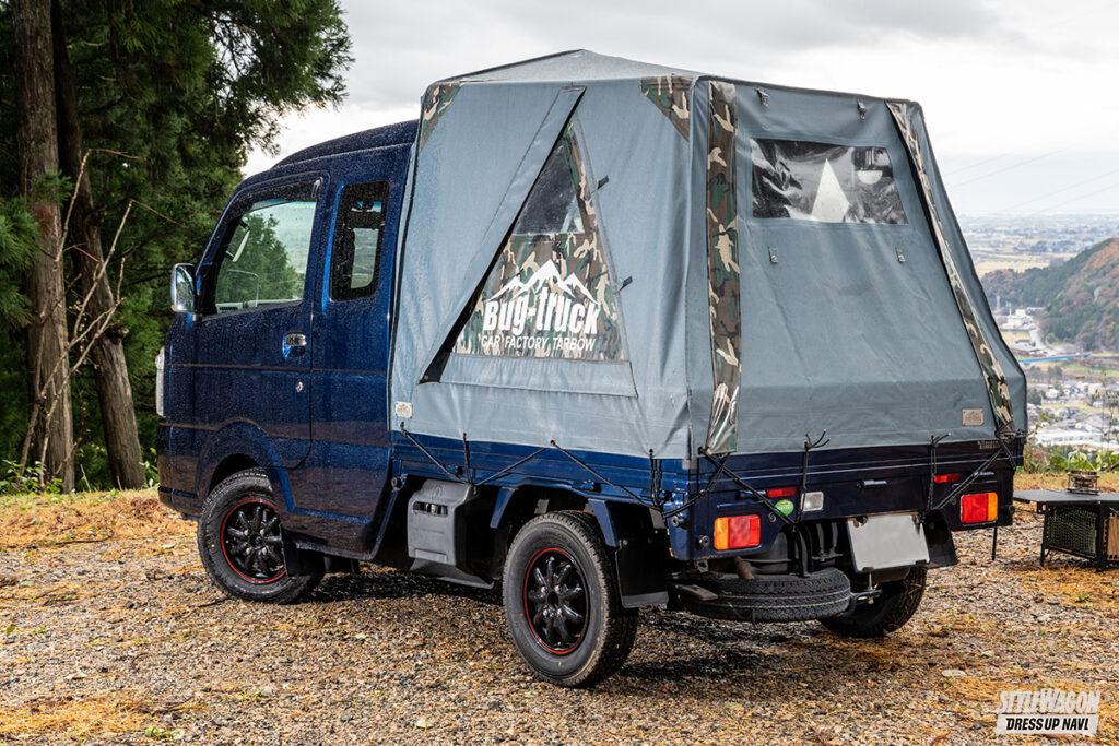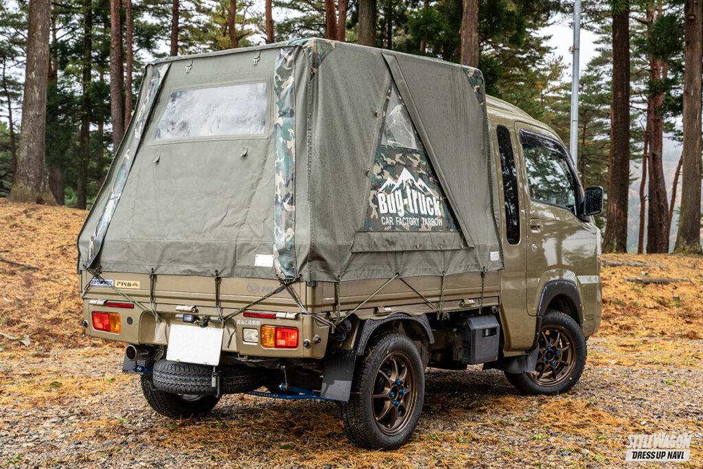 ちょいアゲ仕様のジャンボに6年以上使い込む初期バージョンのテントキットを積んでいるつとむさん。季節を問わず風雨ときには雪に埋もれる荷台泊キャンプに酷使しているものの雨漏りなどは一切ないとのことで、それだけキャンパープロが生まれながらにして完成度の高いプロダクトなのだといえる。バグトラに魅入られたつとむさん曰く「購入を迷っている方は是非とも試してみる事をオススメします」とのこと。