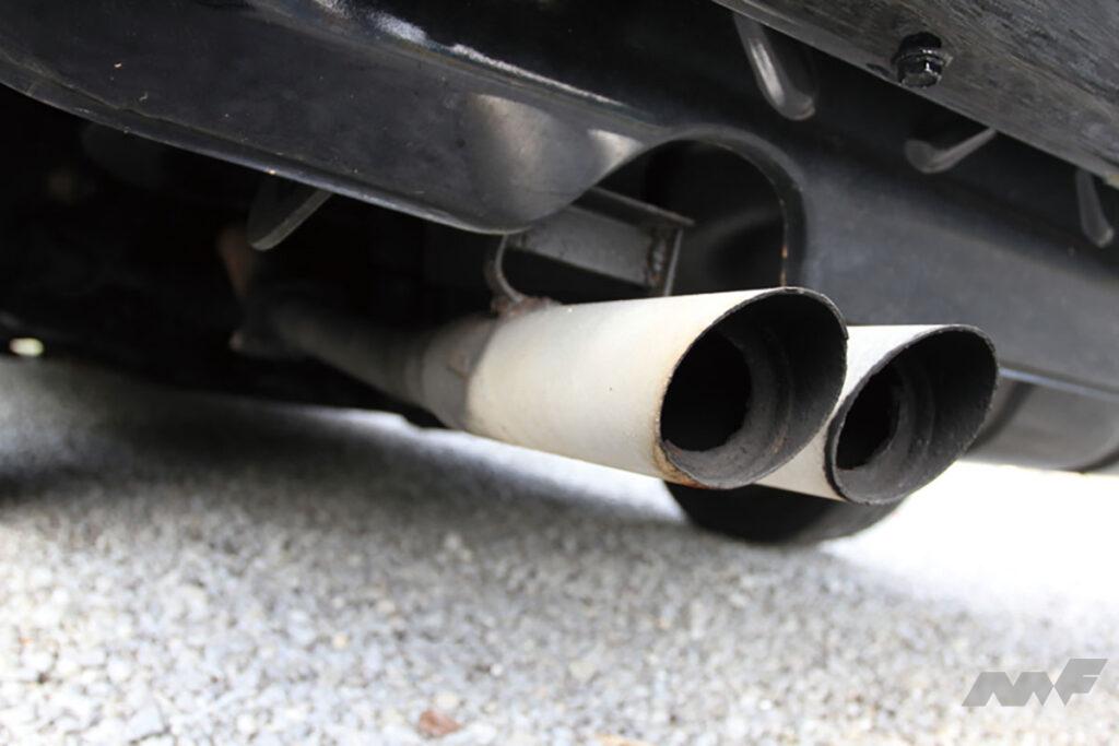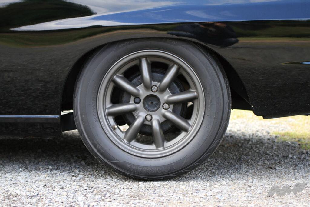 シンプルにキメたジャパンに抜群のマッチングなワタナベエイトスポーク。前後15インチで、前が6.5J+19.5、後ろが7J+1.5というサイズ。組み合わせるタイヤはYOKOHAMA Sドライブの205/60-15。