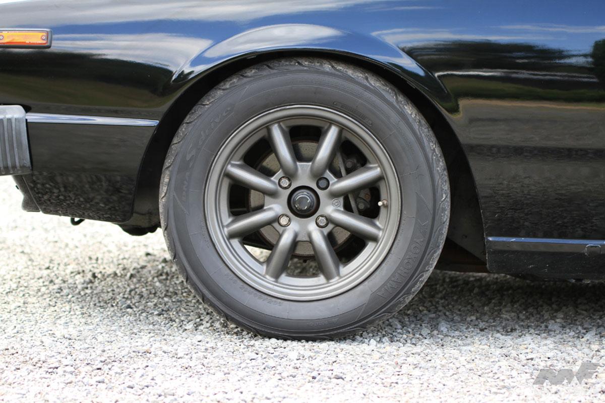 シンプルにキメたジャパンに抜群のマッチングなワタナベエイトスポーク。前後15インチで、前が6.5J+19.5、後ろが7J+1.5というサイズ。組み合わせるタイヤはYOKOHAMA Sドライブの205/60-15。