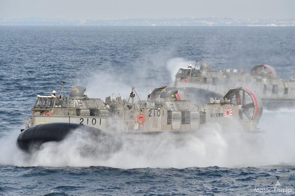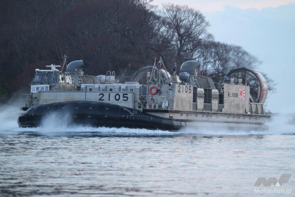 これは海上自衛隊が配備するエアクッション方式の揚陸艇「LCAC(Landing Craft Air Cushion)」だ。英表記の頭文字を取り「エルキャック」と呼ばれる。エアクッション方式とは、いわゆるホバークラフトのこと。ホバークラフトは船体底部のラバー製構造物に空気を注入、噴出し浮き上がる。前後進などの推力は主にプロペラによって発生させている。水上航行に加えて波打ち際や砂浜など陸上部もそのまま航行できる乗り物だ。上陸用舟艇のジャンルに入り、海自はこれを上陸作戦や物資等を陸揚げする揚陸作戦用途などに向けて装備している。また、ホバークラフトはかつて一般航路に就航しており、乗船経験のある方もおられると思う。