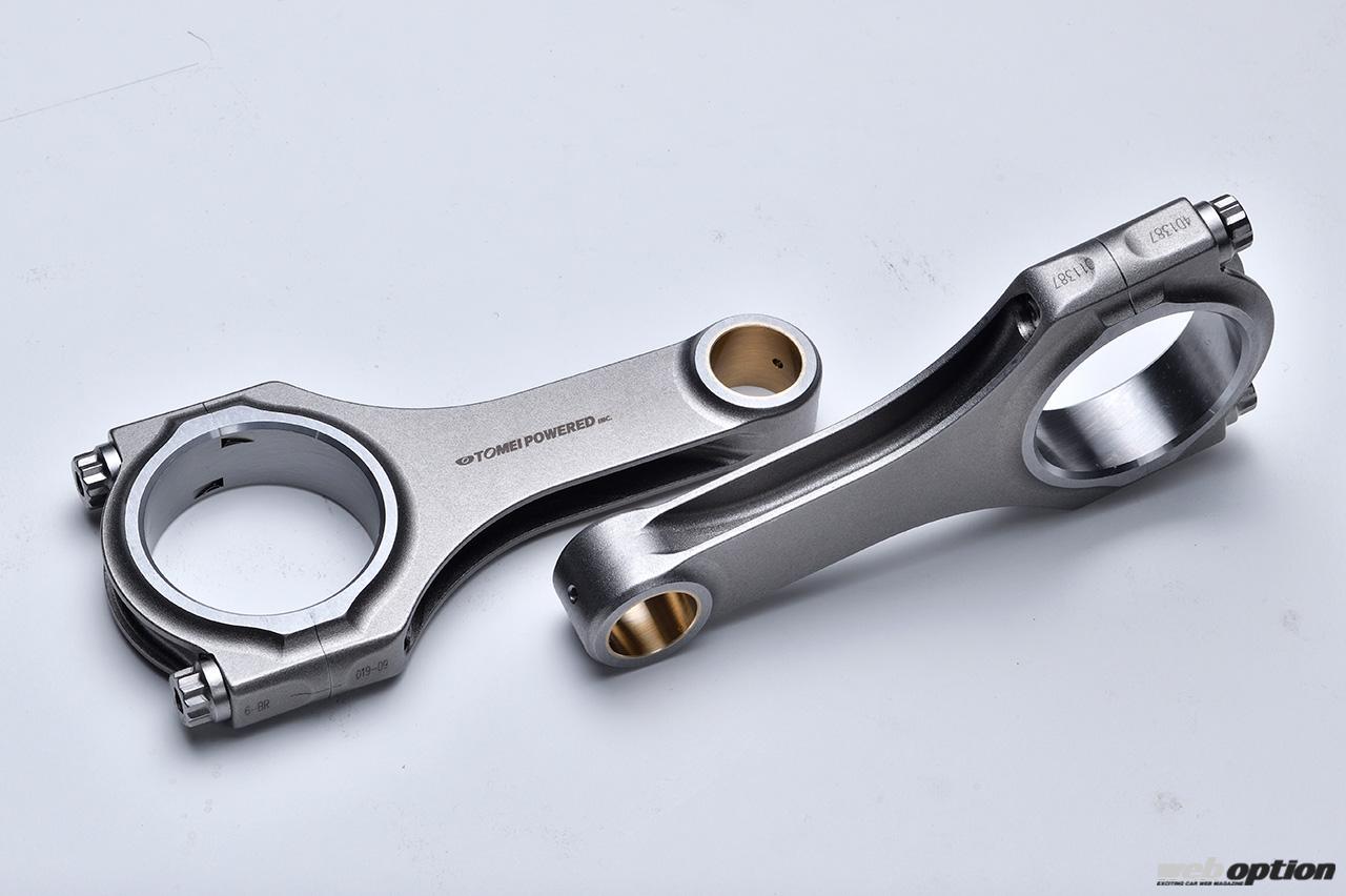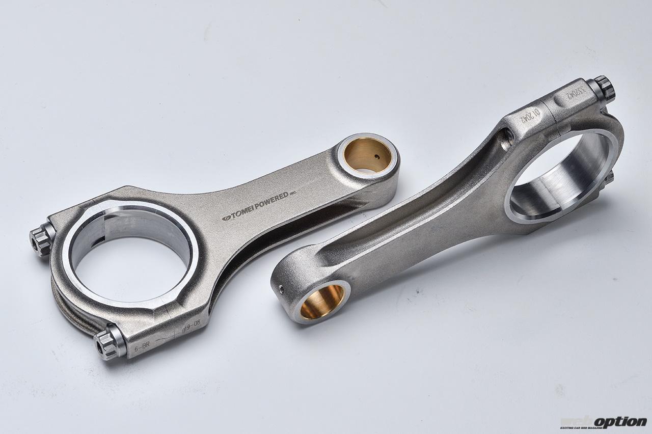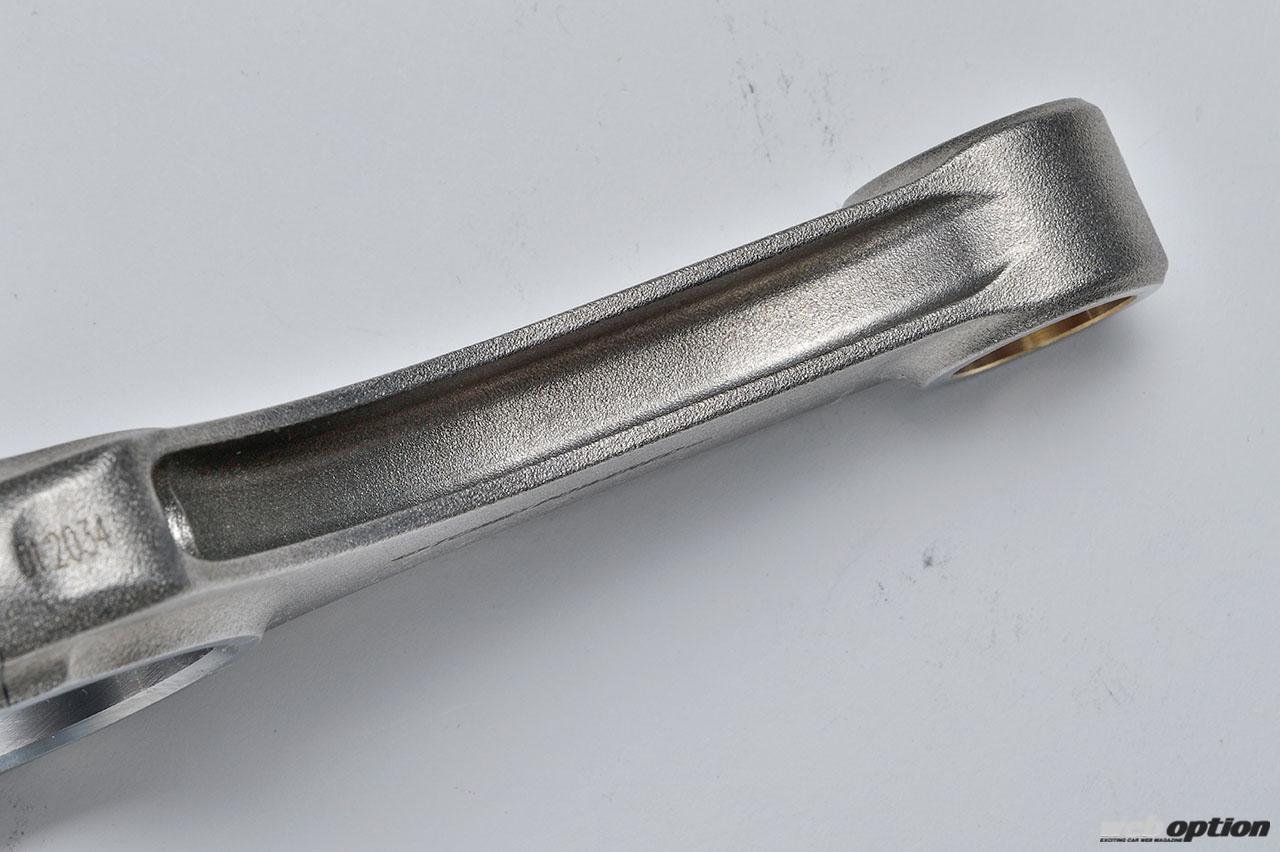 RB26&RB25用コンロッドの中心距離は121.5mm。SNCM439材を採用し、重量を抑えながら高い座屈強度を確保するためにH断面形状としている。また、ロッドとキャップ部の合わせ面の面積を大きく取ることで結合強度をアップ。大端部の変形を抑えているのも特徴だ。さらに、小端部の上方にオイル穴を設けてオイルを効率よく取り込む構造に。ロッド部の疲労強度を高めている。コンロッドボルトはARP製。引張応力に耐えられる特殊鋼を採用した独自形状となっている。