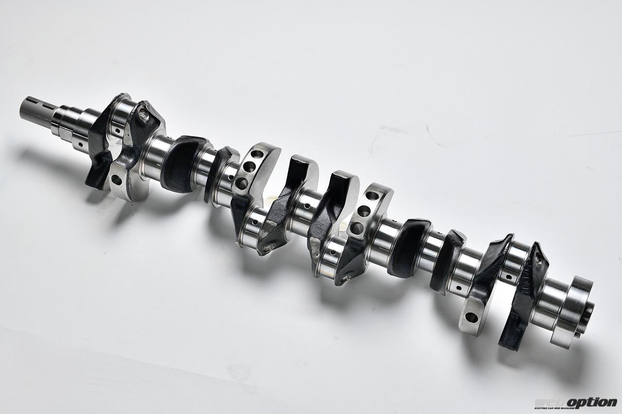RB28用のクランクは、専用ピストン&コンロッドと組み合せて使用。高精度バランス処理を施した8カウンタータイプだ。ストロークは純正が73.7mmなのに対し、2.8L仕様では77.7mmに延長される。特徴は敢えてフルカウンターではなく、スモールタイプの8カウンター仕様とし、重量を抑えていること。ウェイトを軽くすることでメタルへの負担も抑えられるし、レスポンス面でも有利。排気量アップとの相乗効果で、低速トルクの向上が実感できる。また、クランクプーリー取り付け部にはWPC処理を施し、焼き付きを予防している。