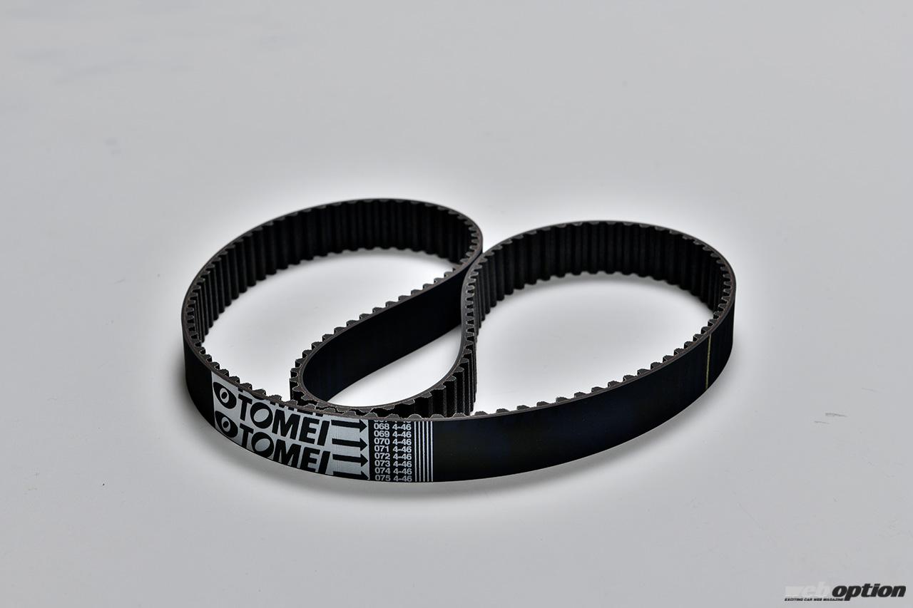 過酷な状況下に晒されるタイミングベルト。ハイカムや強化バルブスプリングを組み込んだチューニングエンジンでは、さらに条件は厳しくなる。東名パワードの強化タイミングベルトは、素材の最適化により強度を高めた上に、高温時の引っ張り強度を高めるべくケブラー繊維を織り込むなどして耐久性を向上。寿命は2倍以上となっており、安定したベルト駆動を実現する。RB20やRB25にも適合する。