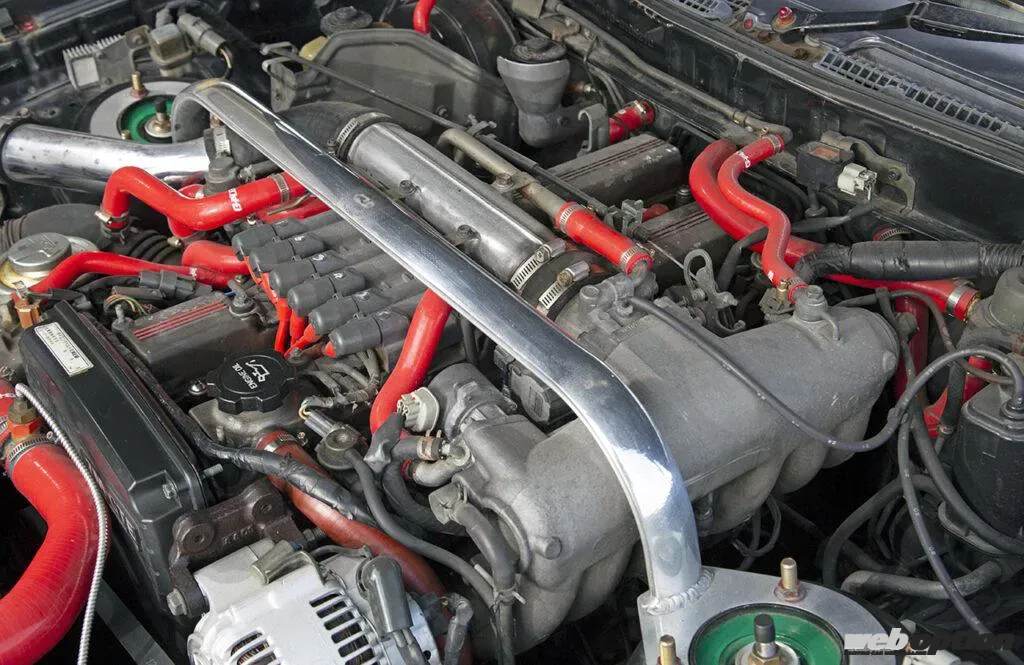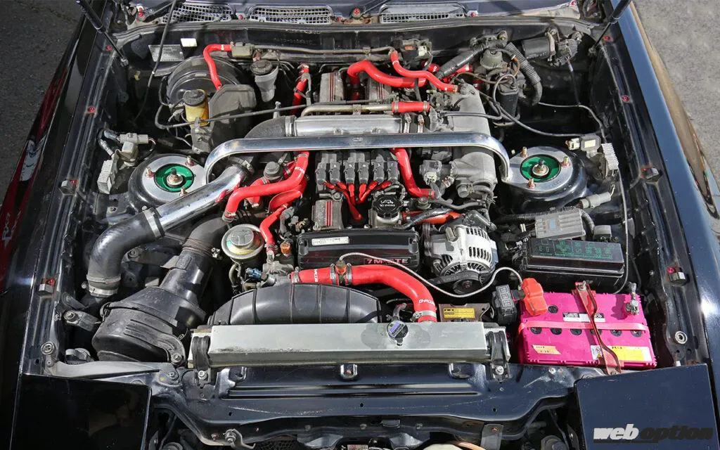 パワーユニットはほぼ純正をキープしており、経年劣化が避けられないホース類は強化品に交換済みだ。ちなみに、ターボA専用のCT26タービンは標準モデルよりも風量アップが施され、コンプレッサーハウジングに“E”の刻印が入る。