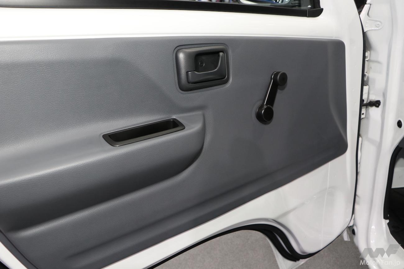 ドアウィドウの開閉は、懐かしの手巻き式。シートも運転席のみスライド機構が備わる。2名乗車仕様だが、インパネシフトとワイドタイプの助手席におかげで、足元も広く、快適なスペースが確保されている。