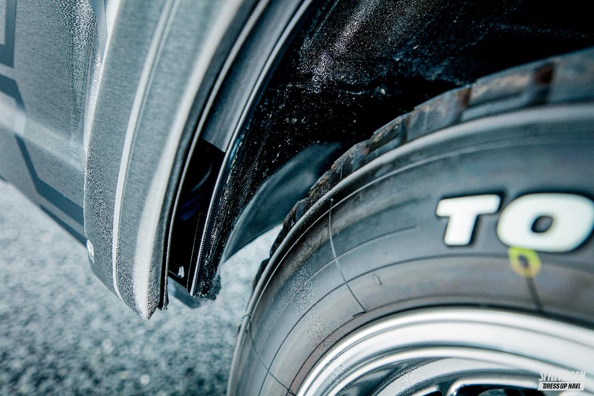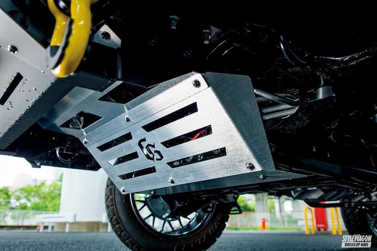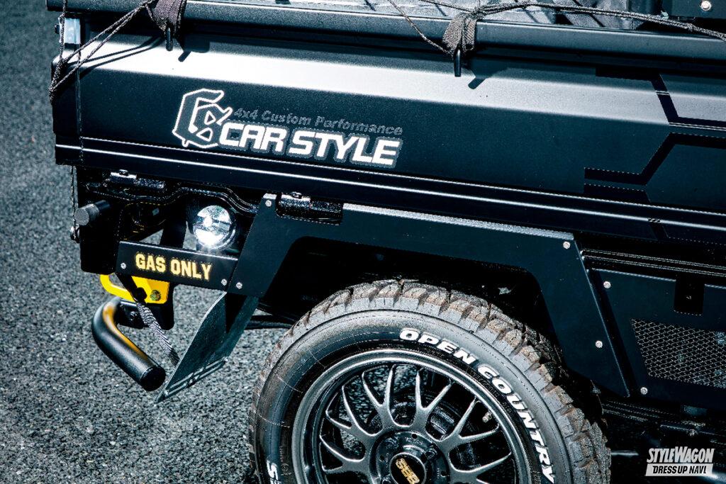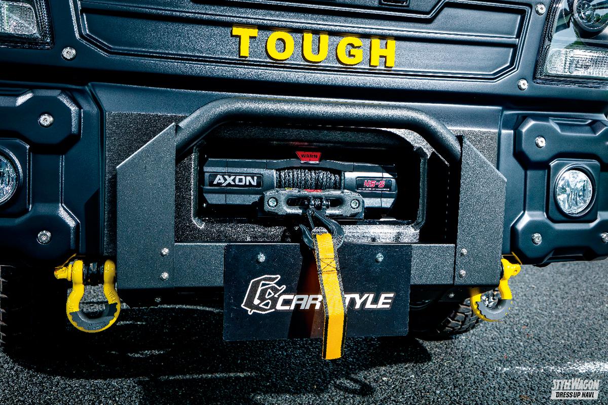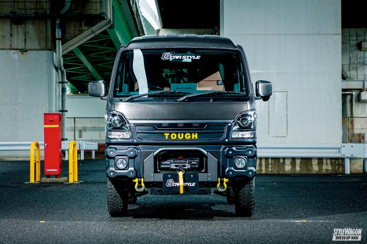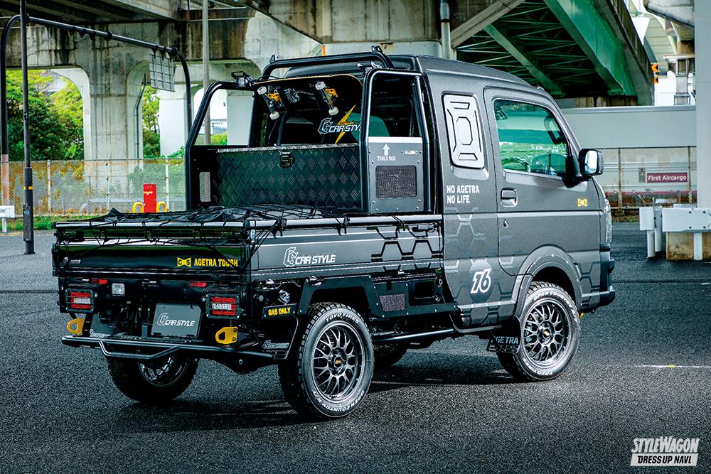 キャビンのボリュームがあるスーパーキャリイのスタイリングにあわせ、化粧ボルトでGショックのようなギア感を加えたフロントバンパーやスチール仕立てのオーバーフェンダーなどによってタフネスオーラを存分に高めあげたのが「アゲトラ・ギア タフ」。もちろん、要チェックとなるのはグッと前方へ押し出したバンパーフォグとバンパーガード内に収められたウインチがワイルドなフロントセクションだが、これだけ重厚感あるフェイスでもフロントヘビーに見えないのはサイド窓パネルとラックボックスタワーバーによる絶妙なバランシングが図られているからだ。ボディへ馴染ませたアクティブスタイルは、軽トラカスタムにおいて新たなベンチマークとなっていくだろう。