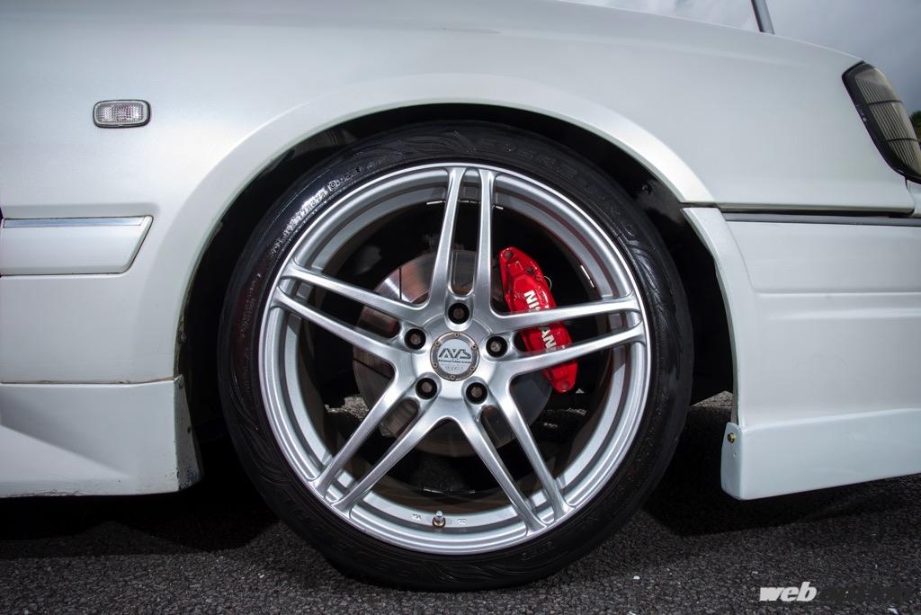 現在履いているホイール&タイヤは街乗り用で、前後18インチのAVSモデル5にフェデラルの595RSを組み合わせる。ドリフト時は、BCNR33純正ホイール+フェデラルSS595(235/40-17)へと変更するそうだ。