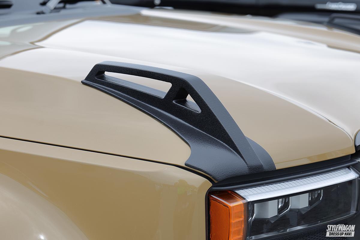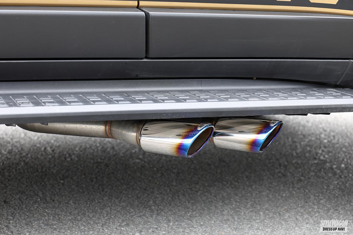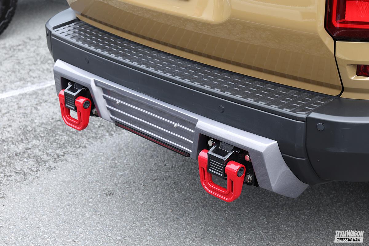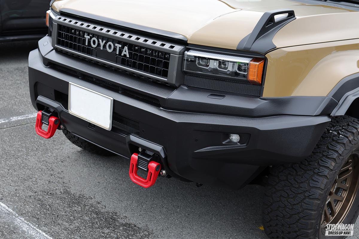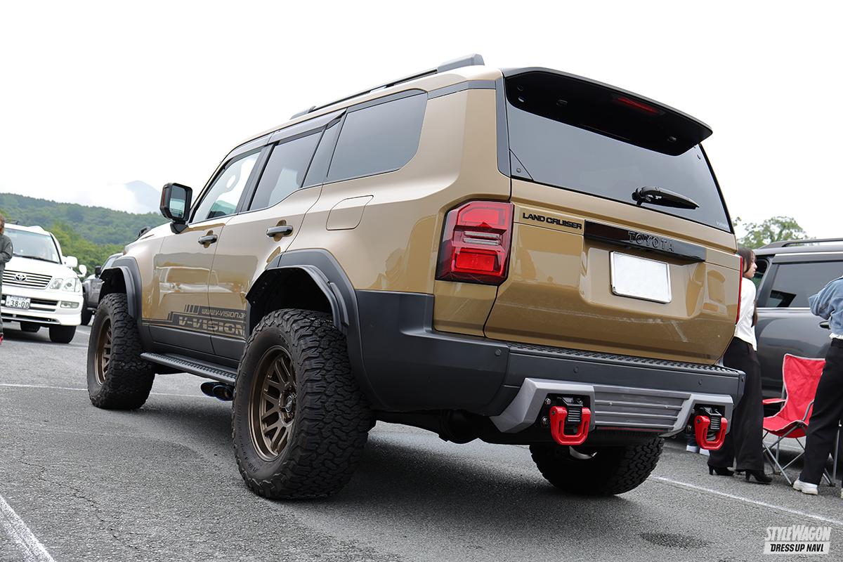 当車は、ミニバンのカスタムでも存在感を放つVビジョンの新作エアロを装着しているのが特徴。薄型&ワイルドなけん引フックがついたフロントマスクは迫力満点! 33インチタイヤ装着も相まって、会場でも注目度の高い1台だったのだ。ボンネット先端のグリップ(?)は試作品。ブッシュワイヤーのベースで、早い時期の製品化を待っている人も多いかも。サイド出しマフラー(Vビジョン製)等々、各所に見ドコロが満載だった。