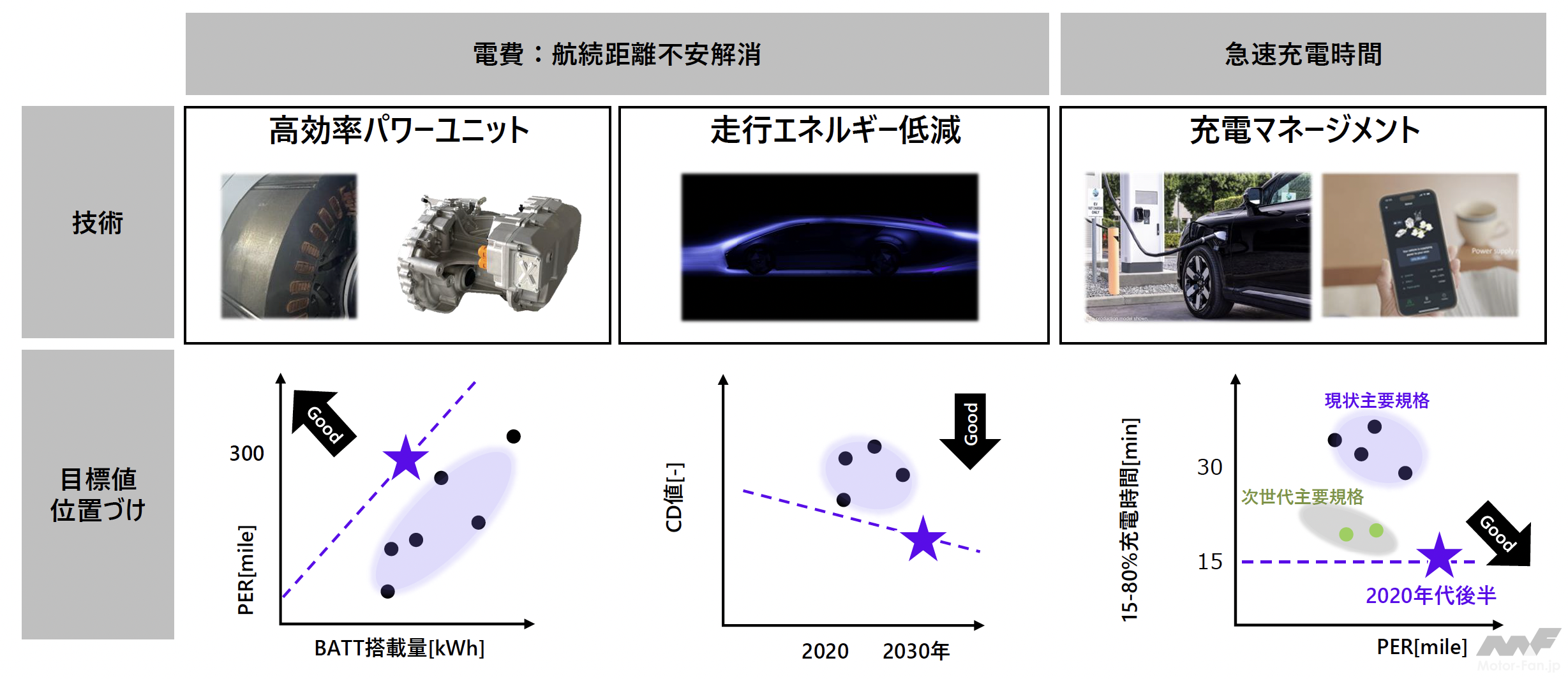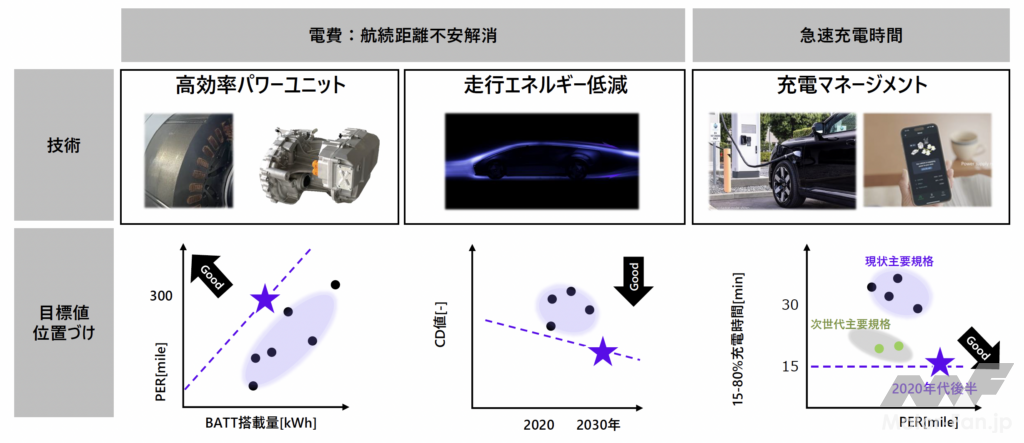 具体的な搭載量については明かされなかったが、少なくとも航続距離は500km程度として、100kWhオーバーのようなバッテリーは積まないということだろう。Prologueがバッテリー85kWhで航続距離が300マイルだから、少なくともそれ以下、資料のグラフを見ると、大幅に少ないバッテリー搭載量で可能にする目標のようだ。