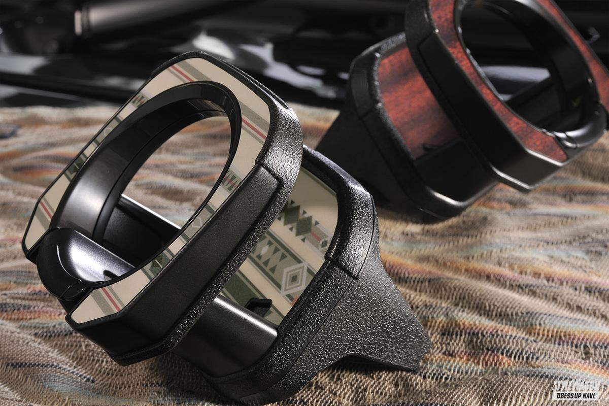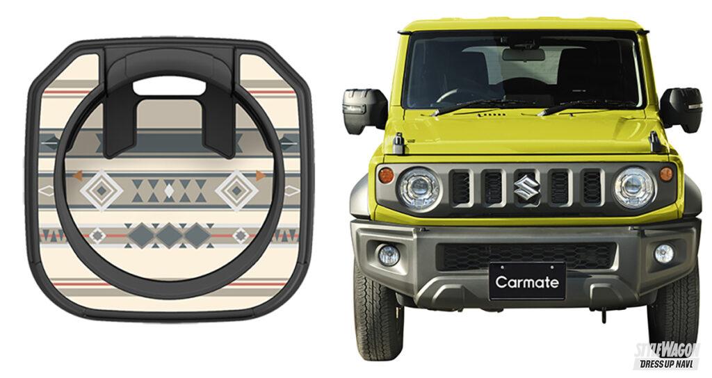 深みのある「ウッド調」は、直線的で滑らかな木目が特徴のマホガニー材をイメージしたカラーリング。ブラックカラーのインパネとも相性が良く、車内のアイキャッチとしても非常に効果的だ。一方でひし形を中心とした幾何学的な図形を組み合わせたのが「オルテガ柄」。しかも本体底面をよく見ると、ジムニーのフロントフェイスがモチーフとなっているユニークな一面も大きな魅力だ。