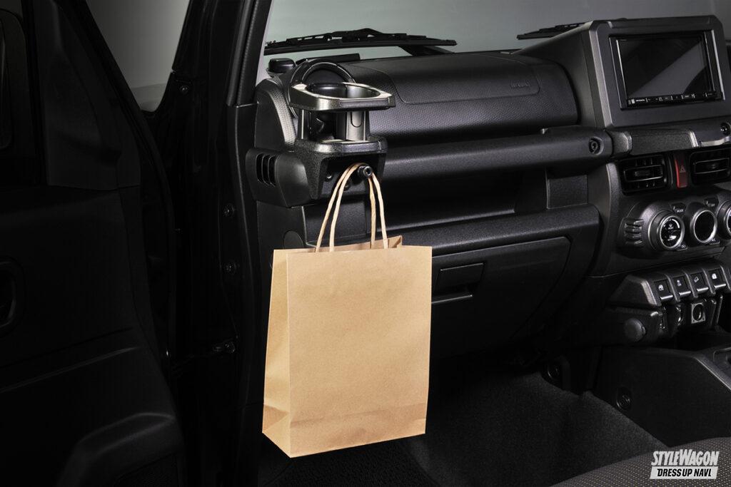 そんなジムニー専用ドリンクホルダーは、使い勝手も非常に高い。定番の運転席/助手席それぞれのエアコン前だけでなく、ドアグリップの計4ヶ所に取り付けが可能。さらに本体下には買い物袋やゴミ袋などをかけられるフックが装備されている。