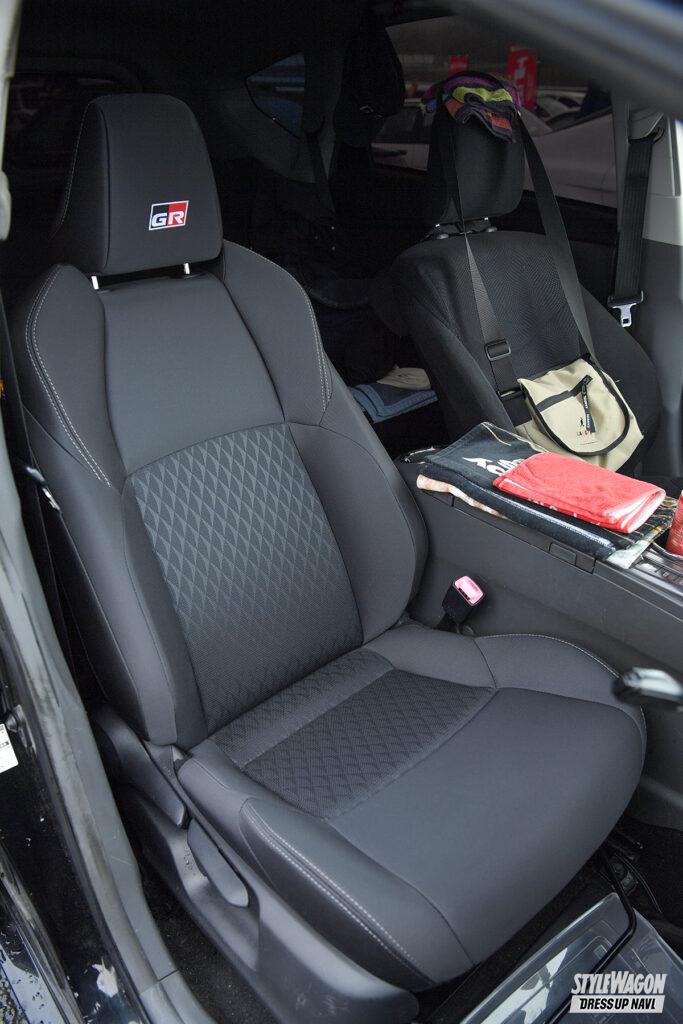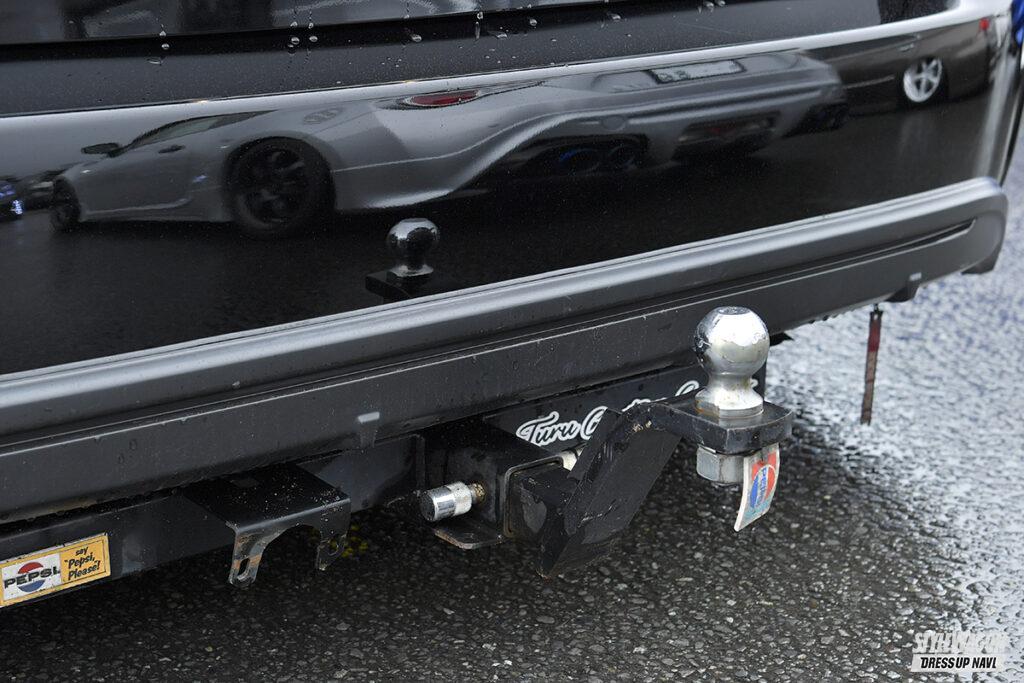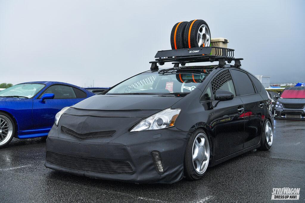 今回のために装着したフルブラがインパクト満点なプリウスα。USを意識したカスタムに力を入れており、カートのルーフラックやウインドウに挟み込むメッシュなど雰囲気アップの小ワザも抜かりなし。注目はホイールで、80スープラ純正の16インチを流用。タイヤを引っ張って組んでいるため、純正なのにそれっぽく見えないのが面白い。80スープラ純正はF8J·R9Jと前後でサイズが異なるが、フロントにも9Jを収めたのがこだわり。