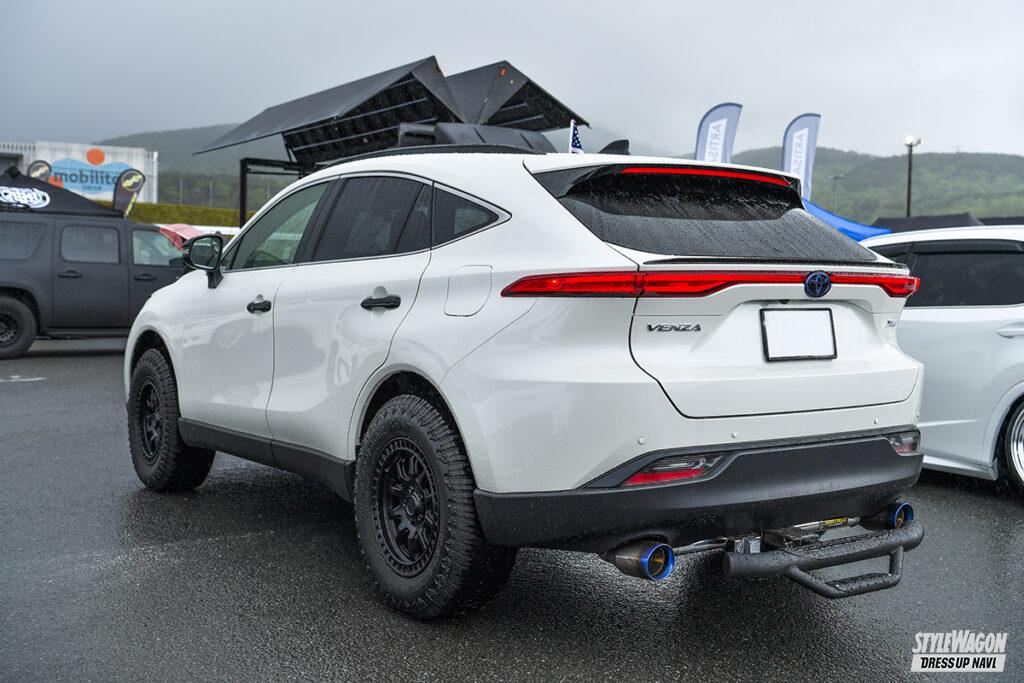 スタイリッシュなフォルムが特徴の80ハリアーは、北米では「ヴェンザ」の名で販売されている。そこでエンブレムやスカッフプレートなどヴェンザ純正パーツを取り寄せ、他とさり気なく違いを出す。イジりもUS寄りで、ノーズブラやUS純正テールランプなどパーツを厳選して理想の仕様に。この仕様にはメッキがしっくり来ないため、ベーシックなSグレードの樹脂パーツに交換した。