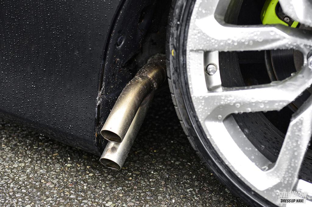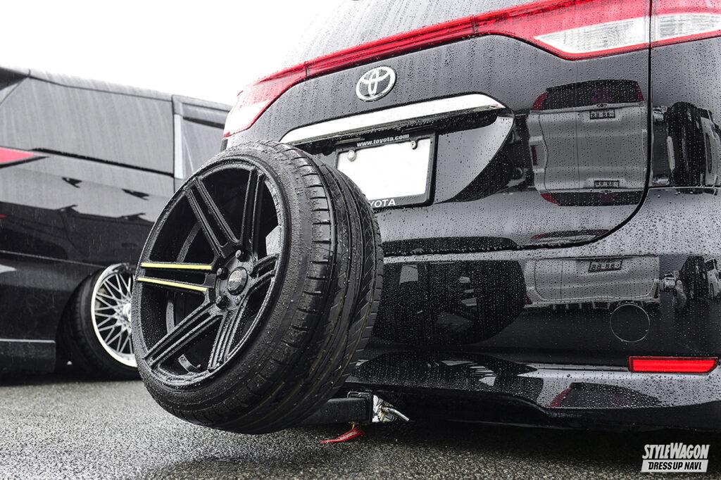 「自分のやりたいようにやりました」と話すリューさん。目指したのはUS風スタイル。フロントのフェンダー部から延びるダミーアンテナも、USチックでイイ感じだ。当車で気になったのがリアまわり。とくに背面タイヤに視線集中! ヒッチメンバーにひと工夫してタイヤをセットしたのだが、迫力は抜群だ。コレに合わせてマフラーをリアタイヤハウスから出したりと、やることなすことすべて規格外。実はホイールもユニークなんですよ!!