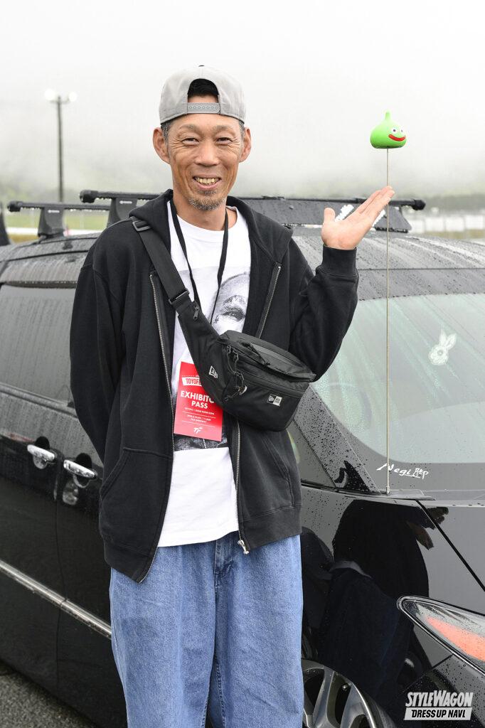 「自分のやりたいようにやりました」と話すリューさん。目指したのはUS風スタイル。フロントのフェンダー部から延びるダミーアンテナも、USチックでイイ感じだ。当車で気になったのがリアまわり。とくに背面タイヤに視線集中! ヒッチメンバーにひと工夫してタイヤをセットしたのだが、迫力は抜群だ。コレに合わせてマフラーをリアタイヤハウスから出したりと、やることなすことすべて規格外。実はホイールもユニークなんですよ!!