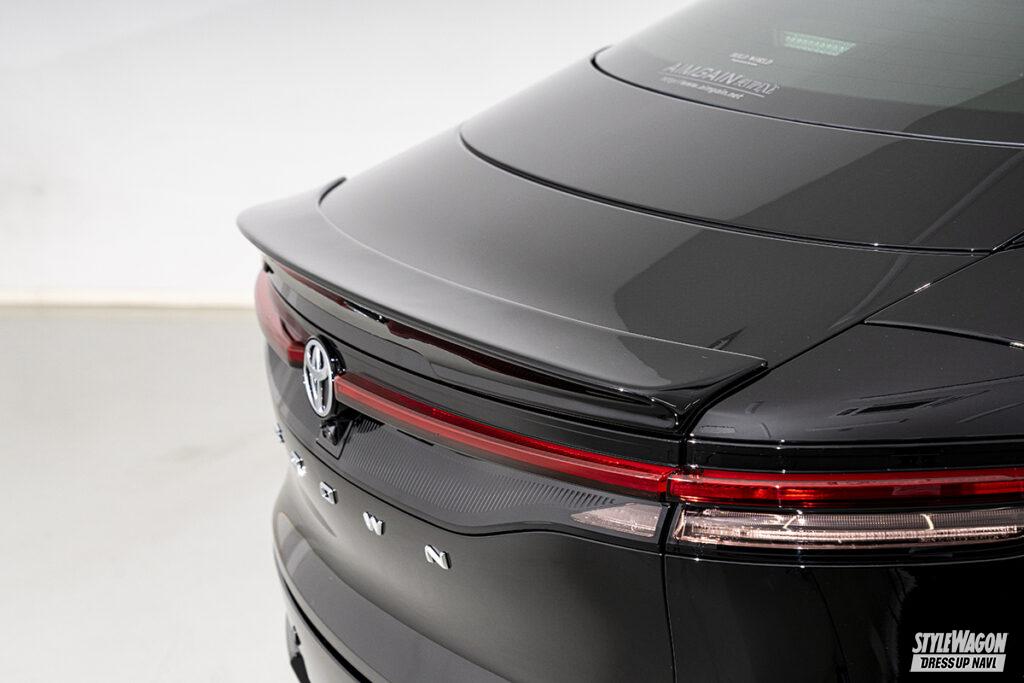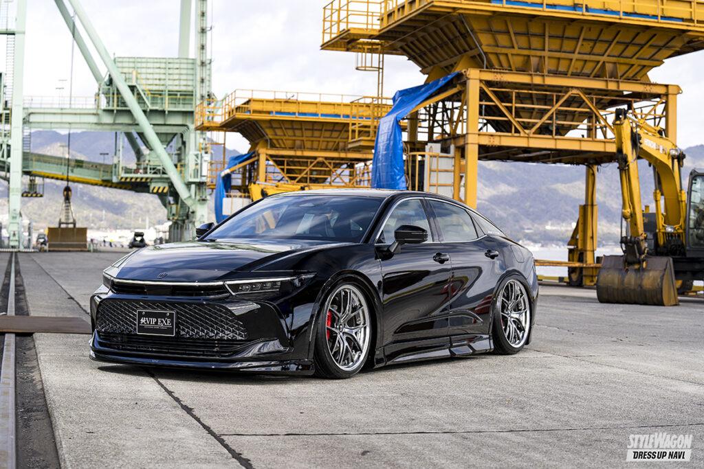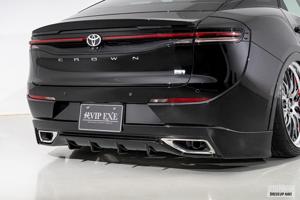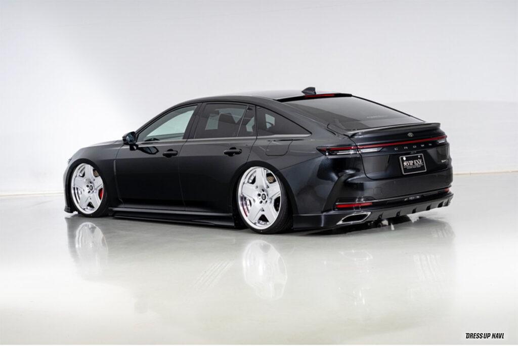 現在開発中というエステートを含め、シリーズ全モデルをラインアップするエイムゲインだが、新型クラウン発表と同時に開発を進めたのがこのクロスオーバー。クロスオーバーはSUVとセダンの融合という位置づけだが、エイムゲインの提案は、新型の良さを活かしたジェントルなスタイル。シンプルかつクリーンにデザインされたエアロキットは、純正バンパーの一部を覆い隠すハーフタイプで、適度に丸みを持たせることで上質な雰囲気を演出。リアスタイルの物足りなさを解消するトランクスポイラーとルーフスポイラーには、プレミアム感を高めるカーボンモデルも設定するなどより個性的なスタイルを楽しめるラインアップとなっている。そして圧倒的なワイド&ロースタイルを打ち出しているのがエアサスによる恩恵。シンプルに徹したエアロパーツとシャコンスタイルの組み合わせは、クラウンらしい王者の風格が満ち溢れている。