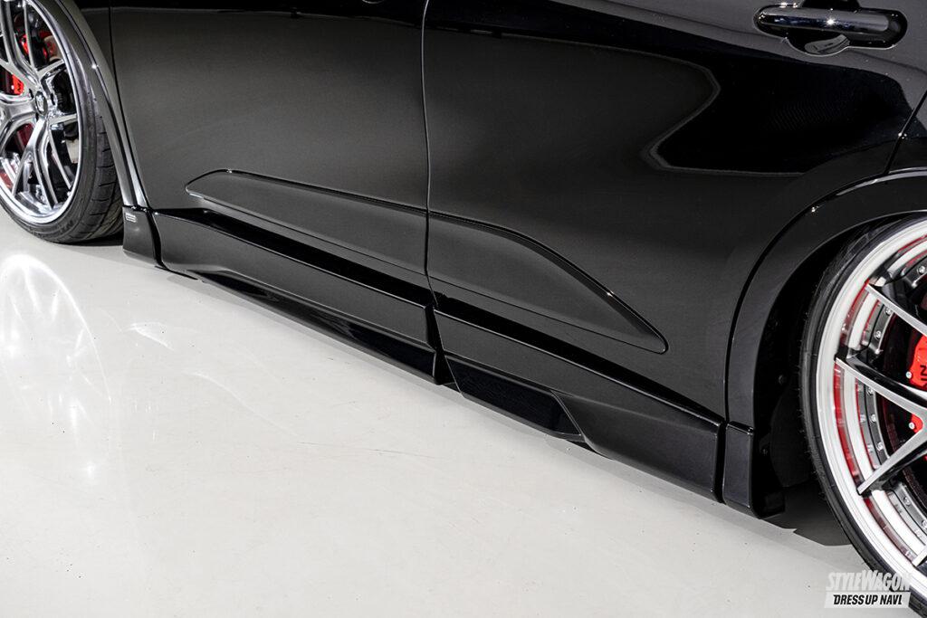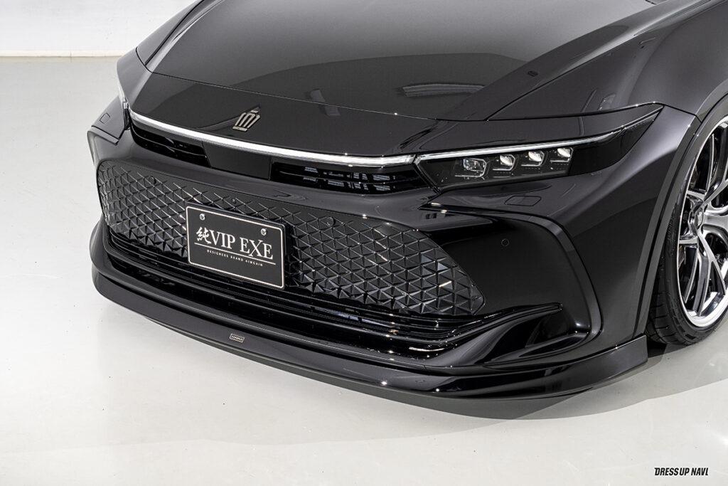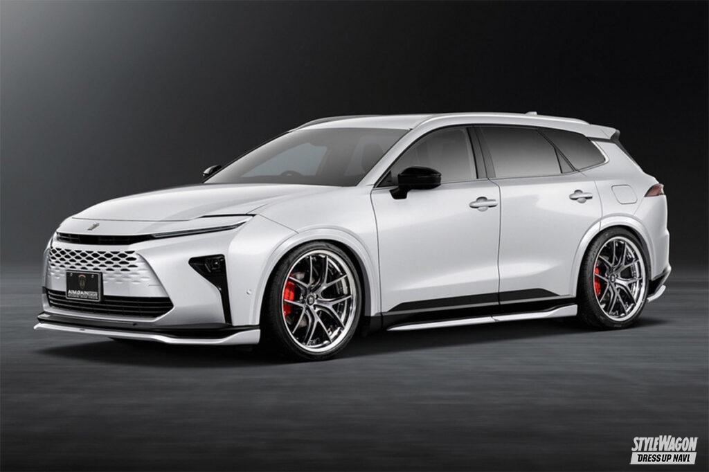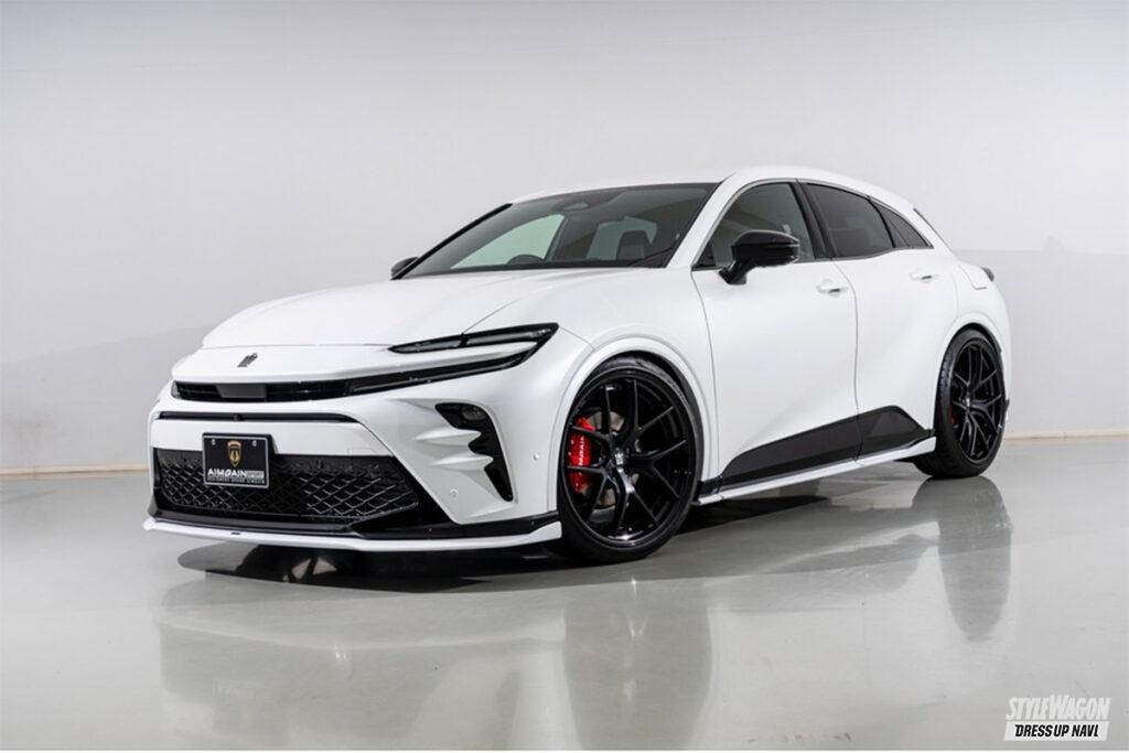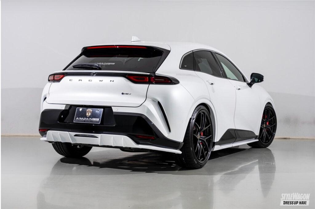 現在開発中というエステートを含め、シリーズ全モデルをラインアップするエイムゲインだが、新型クラウン発表と同時に開発を進めたのがこのクロスオーバー。クロスオーバーはSUVとセダンの融合という位置づけだが、エイムゲインの提案は、新型の良さを活かしたジェントルなスタイル。シンプルかつクリーンにデザインされたエアロキットは、純正バンパーの一部を覆い隠すハーフタイプで、適度に丸みを持たせることで上質な雰囲気を演出。リアスタイルの物足りなさを解消するトランクスポイラーとルーフスポイラーには、プレミアム感を高めるカーボンモデルも設定するなどより個性的なスタイルを楽しめるラインアップとなっている。そして圧倒的なワイド&ロースタイルを打ち出しているのがエアサスによる恩恵。シンプルに徹したエアロパーツとシャコンスタイルの組み合わせは、クラウンらしい王者の風格が満ち溢れている。