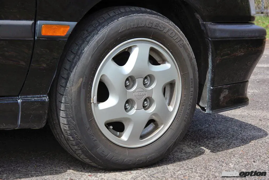 前期型の純正14インチホイールはベルギーのレメルツ製。1994年のマイチェンでコストダウンによる車両価格の見直しが図られ、フォグランプなどとともに標準装備品から省かれることになった。装着タイヤは標準よりもワンサイズ細い185/65R14のエコピアPZ-X。