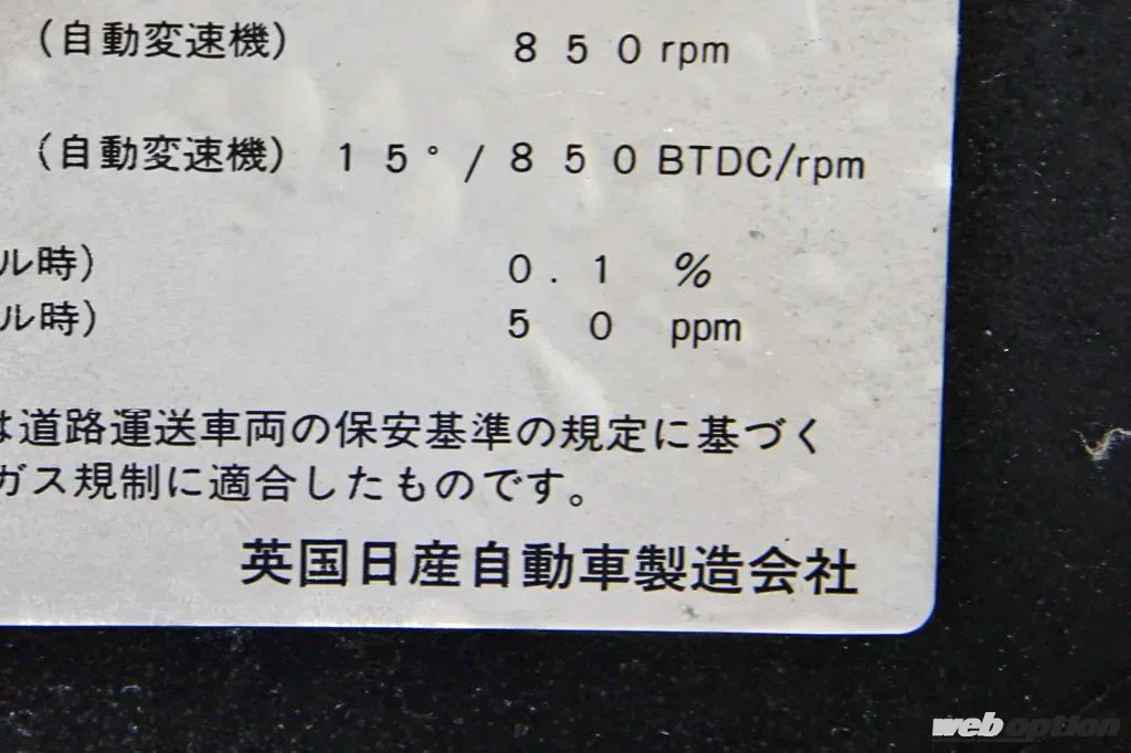 本体に貼られたステッカーから、ディストリビューターはイギリスの電装メーカー“ルーカス”製であることが判明。さらに、ボンネット裏のコーションステッカーには、“英国日産自動車製造会社”との表記も確認できる。ちなみに、ラジエターはカルソニック製だ。