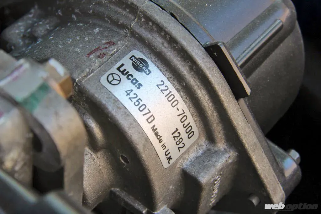 本体に貼られたステッカーから、ディストリビューターはイギリスの電装メーカー“ルーカス”製であることが判明。さらに、ボンネット裏のコーションステッカーには、“英国日産自動車製造会社”との表記も確認できる。ちなみに、ラジエターはカルソニック製だ。